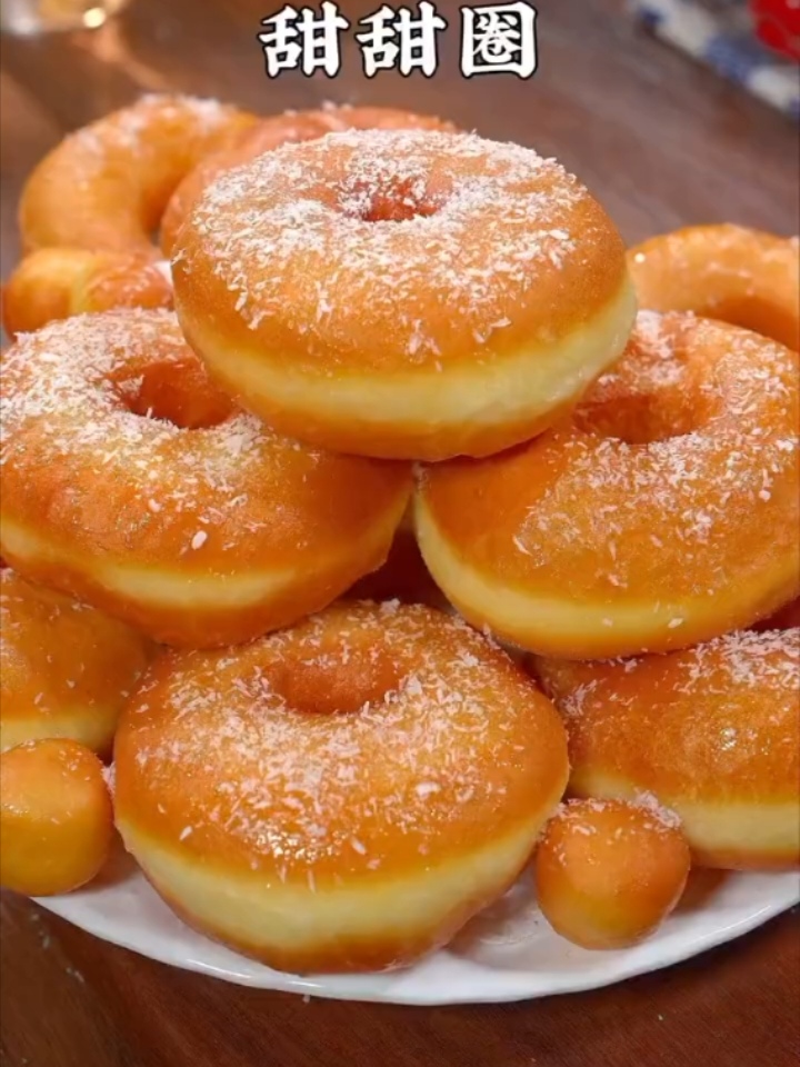 ④起锅烧油,五成油温转中小火,放入甜甜圈,炸至一面表皮金黄再用筷子给它翻个面继续炸,待两面表皮金黄即可捞出控油,再刷上一层蜂蜜,撒入椰蓉,这道美食就做好了。