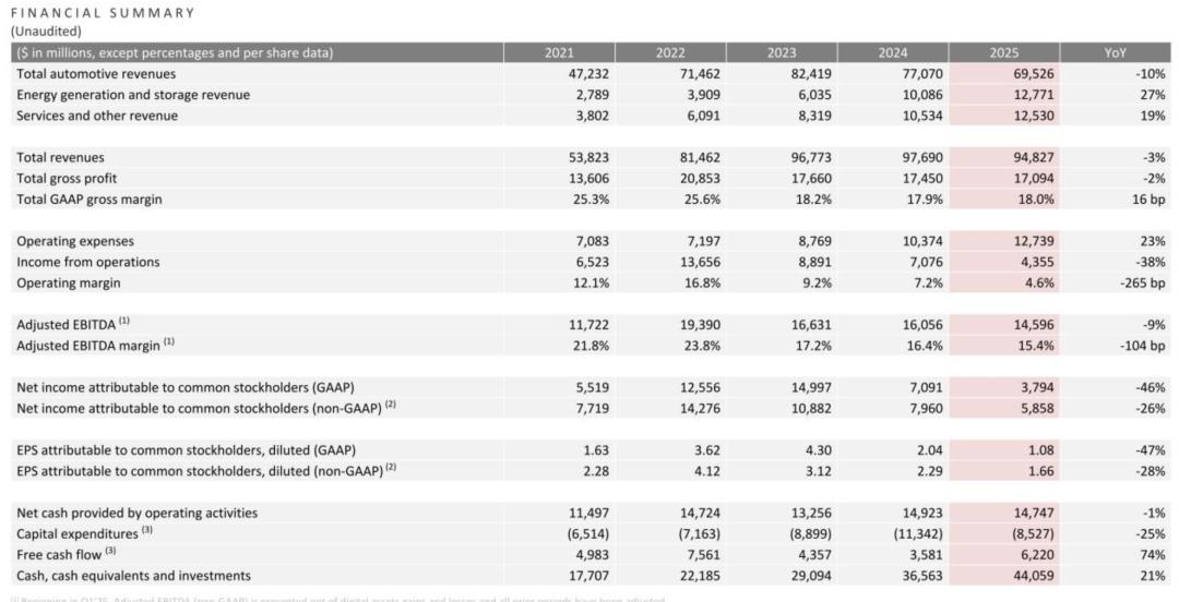 特斯拉(Tesla)日前发布截至2025年12月31日的财报。财报显示,特斯拉2025年营收为948.27亿美元,较上同