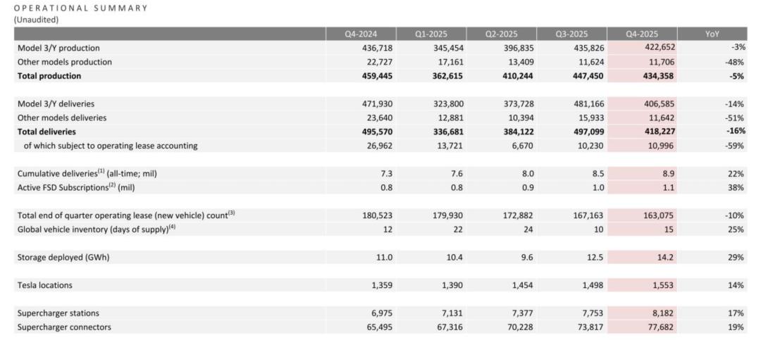 特斯拉2025年第四季度一共生产434,358辆车,较上年同期的459,445辆车减少5%;其中,Model 3/Y生产422,652辆车,较上年同期的436,718辆车减少3%;生产其他类型的车11,706辆车,较上年同期的22,727辆车减少48%。