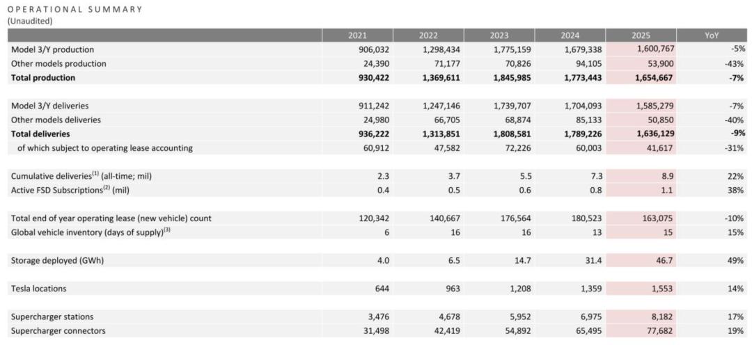 特斯拉2025年一共生产1,654,667辆车,较上年同期的生产1,773,443辆车减少7%;其中,Model 3/Y生产1,600,767辆车,较上年同期的1,679,338辆车减少5%。