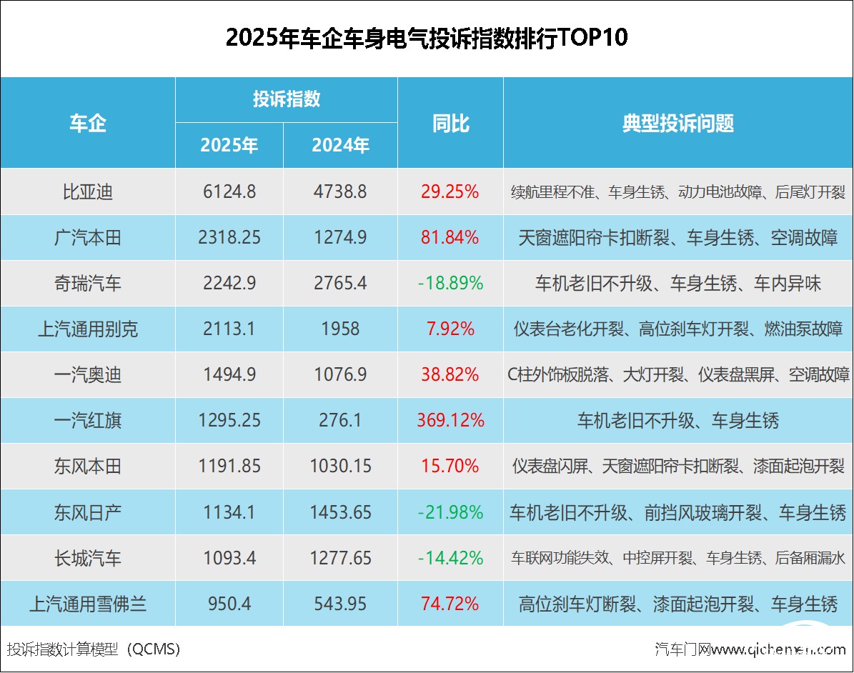 数据显示:2025年,车企车身电气投诉指数达到了46655.4,同比上涨了2%。上榜的十家车企中,奇瑞汽车、东风日产、长城汽车三家车企的投诉指数呈现下滑趋势,其余七家车企则呈现上涨趋势。尤其是一汽红旗,投诉指数同比涨超3倍空降榜单第六名,成为榜单中上涨最快的车企。广汽本田、上汽通用雪佛兰、一汽奥迪、比亚迪、东风本田等车企的投诉指数亦有明显涨幅,其中上汽通用雪佛兰相比去年同期上涨了13个排名,直接跻身榜单前十。