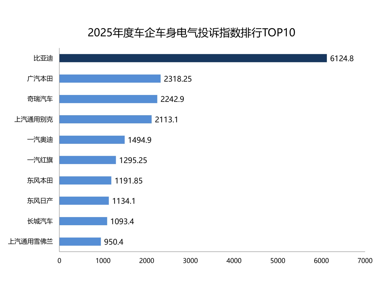 第一名:比亚迪 车身电气投诉指数:6124.8