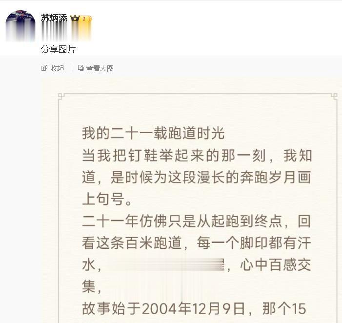 他从2004年开始,当年才15岁,他背着简单的行囊离开中山古镇,他在日记本上写下,我要让全世界看到中国速度,彼时他不会想到,这个看到最终会以怎样的方式震撼世界,2015年,他以9秒99的成绩首次闯入10秒大关的亚洲选手,2021年东京奥运会,他以9秒83刷新亚洲纪录,让博尔特都为之惊叹,想不到亚洲还有这么牛的对手,2025年全运会,他带着腰伤和36岁高龄跑出10秒49,获得第四名,这是他最后一跑了,没有取得想要的成绩,还是比较遗憾。