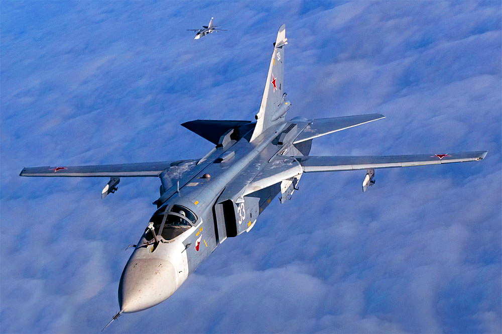 苏-24M歼击轰炸机。最大起飞重量43.75吨,实用升限16500米,速度1654公里/小时,作战半径约1250公里。