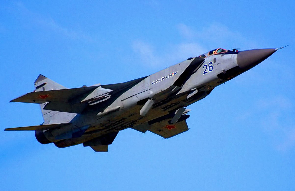 米格-31歼击机。机长22.69米,最大起飞重量46吨,实用升限24000米,速度3900公里/小时,作战半径1500公里。