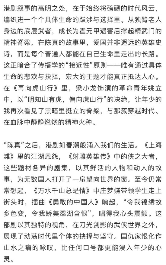 在那个特定历史时期,港台流行文化承担了意想不到的使命。《陈真》等剧集构建的不仅是娱乐产品,更是一种跨地域的情感共同体。当正式教育渠道尚不完善时,那些旋律与画面,在七零后这一代人心中筑起了一座无形的情感长城,让我们完成了对家国的最初想象。港剧之所以能成为我们的精神底色,正因其触碰了中华文化最深层的情感结构——对土地的眷恋、对正义的渴望、对尊严的坚守、对家国的认同。在那个文化资源相对匮乏的年代,它们成为了连接我们与遥远山河的精神纽带。梁小龙本人亦是如此,他因一句“我是中国人”遭封杀近二十年,却始终不悔,这份风骨与他饰演的陈真如出一辙。