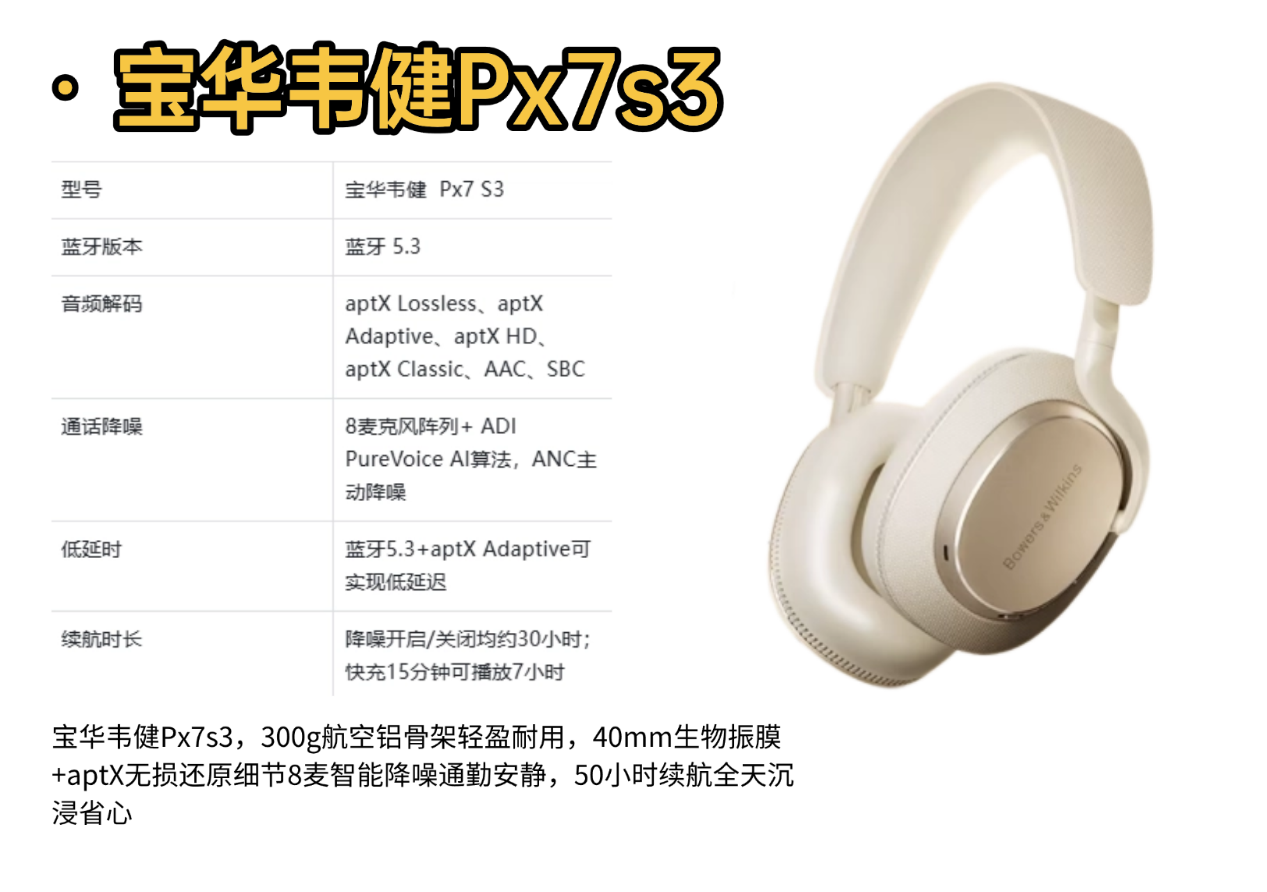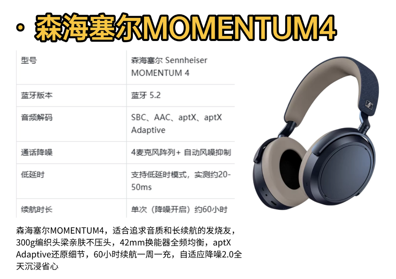 结论:适合追求音质和长续航的发烧友,300g编织头梁亲肤不压头,42mm换能器全频均衡,aptX Adaptive还原细节,60小时续航一周一充,自适应降噪2.0全天沉浸省心