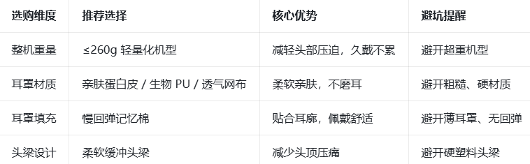 2、优先选整机重量≤260g的轻量化机型,减轻头部压迫感,耳罩选亲肤蛋白皮、生物PU或透气网布材质,搭配慢回弹记忆棉,柔软贴合耳廓,不闷汗、不磨耳,避开硬塑料头梁、薄耳罩的机型