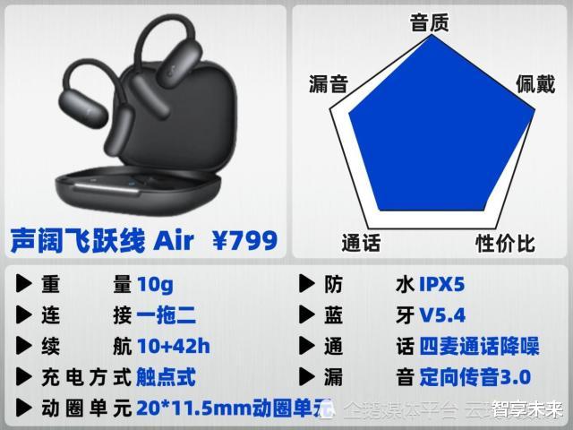 性能配置:声阔飞跃线Air采用蓝牙5.4技术,确保稳定连接与低延迟。拥有长达10小及额外42小时综合续航。去和快充功能。四麦通话降噪结合定向传音技术,即使在嘈杂环境中也能保证清晰通话质量。