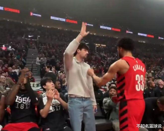开拓者主场球迷鼓掌祝贺阿夫迪亚首次入选全明星,阿夫迪亚起立致谢,杨瀚森在一旁鼓掌祝贺。