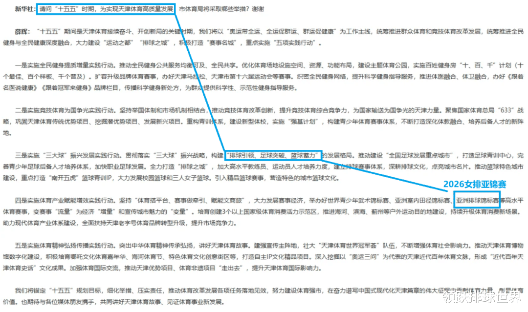 面对新华社的提问环节,涉及到了排球亚锦赛的议题,市体育局在回应中明确表示将“全力打造排球之域”,并点名“亚洲排球锦标赛”在内的高水平赛事,这一回应无疑为外界释放了重要信号:2026年女排亚锦赛,已经极有可能由天津举办。