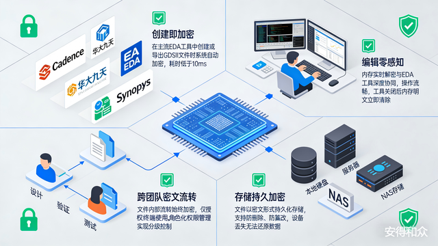 针对GDSII文件在芯片设计流程中的高频编辑、多团队协作、版本迭代等特点,安得和众提供无缝集成、无感加密的全流程防护: