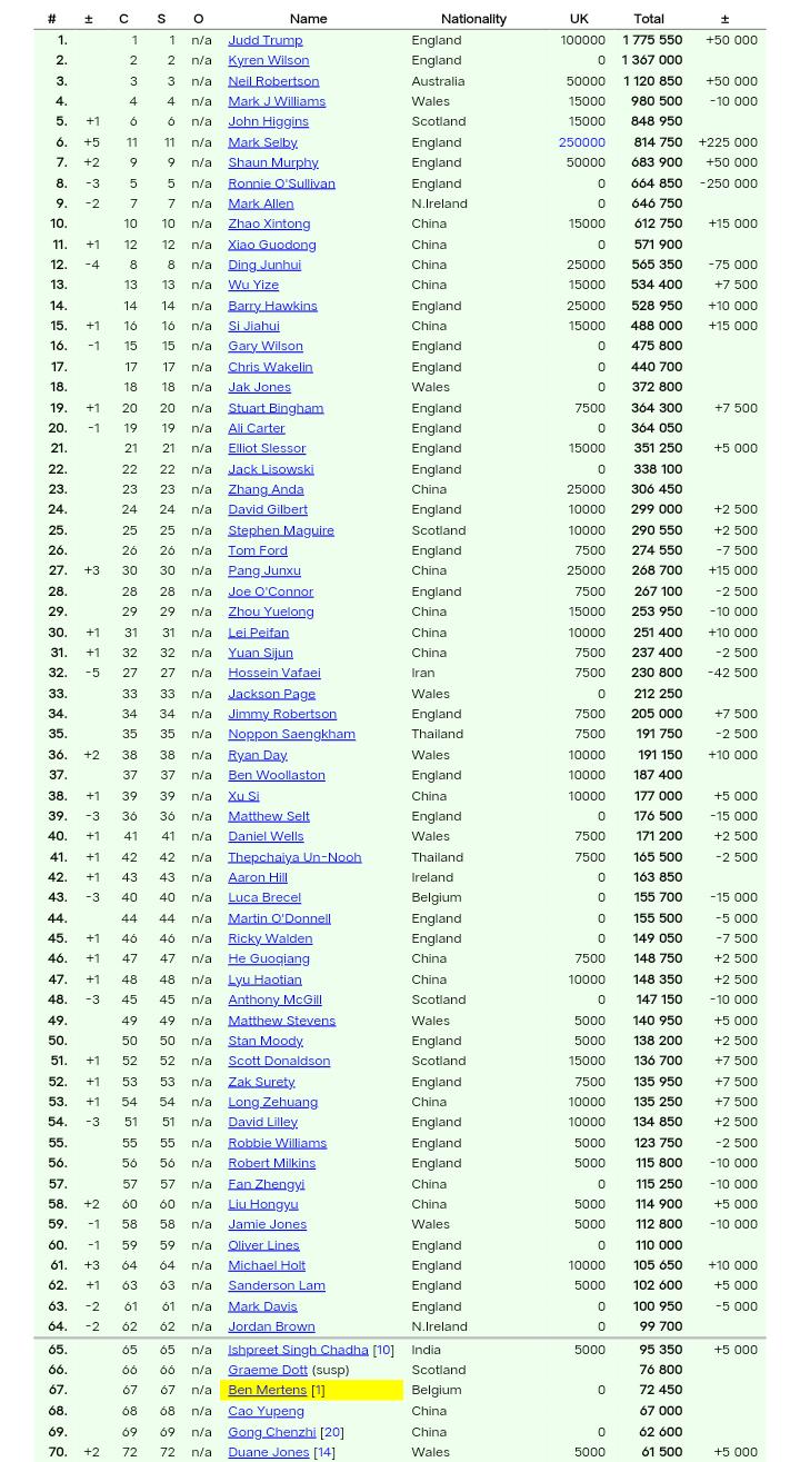 上海大师赛——凯伦·威尔逊11-9阿里·卡特,这是凯伦时隔十年再夺该站冠军,上次正是他排名赛首冠。本站遭遇一轮游,继世锦赛后连续两站三大赛一轮游,排名不变还是第二。