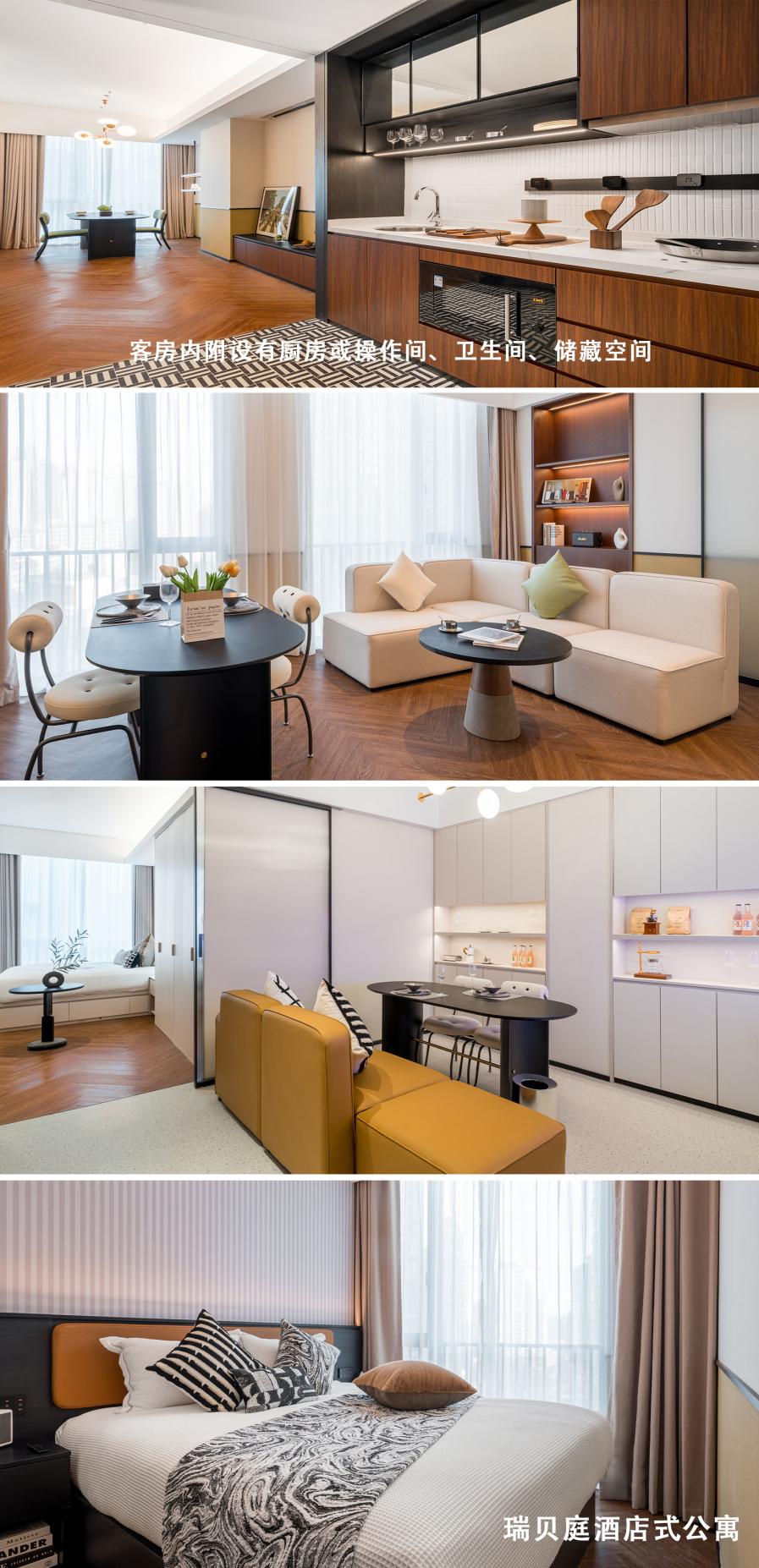 客房内附设有厨房或操作间、卫生间、储藏空间、洗衣机、烘干机,适合长租客人和家庭客人的酒店建筑。