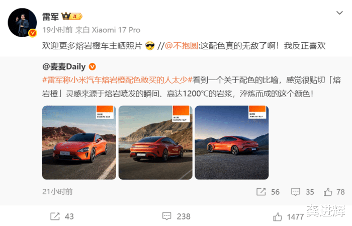 所以,小米SU7、小米YU7放弃帅气的熔岩橙配色,虽然有点遗憾,但算得上是务实之举。当然,还是有不少车主喜欢熔岩橙配色,雷军在微博上喊话更多熔岩橙车主晒照片,评论区瞬间被熔岩橙美照刷屏了,这让他欣慰不已。