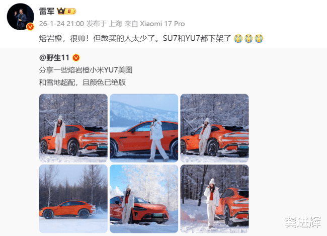 最近,小米掌门人雷军转发网友晒出的熔岩橙小米YU7美图,并写道,“熔岩橙,很帅!但敢买的人太少了。SU7和YU7都下架了!”