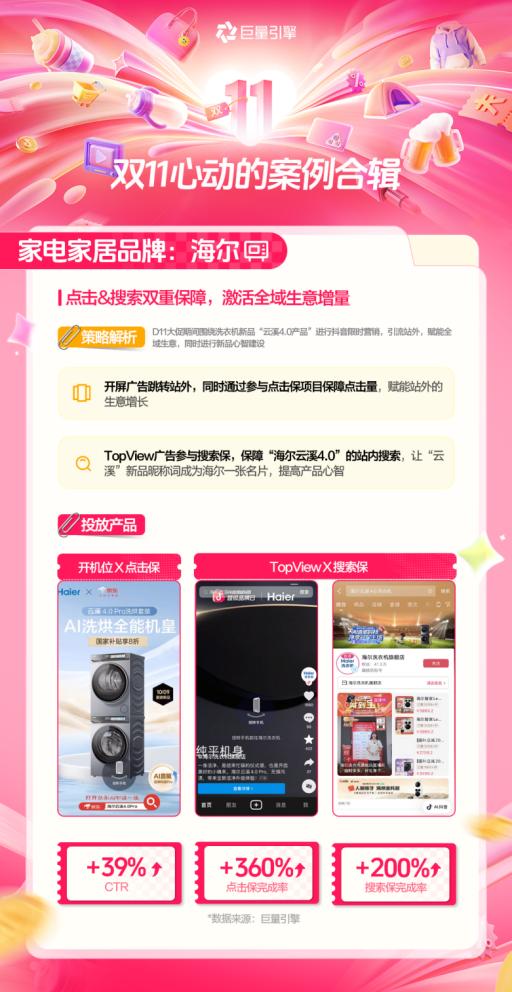 海尔围绕洗衣机新品云溪4.0进行限时营销:开屏广告直跳站外叠加点击保保障点击、TopView参与搜索保提升云溪品牌搜索,帮助新品昵称词快速占位站内心智,实现站内心智+站外转化双向增益。