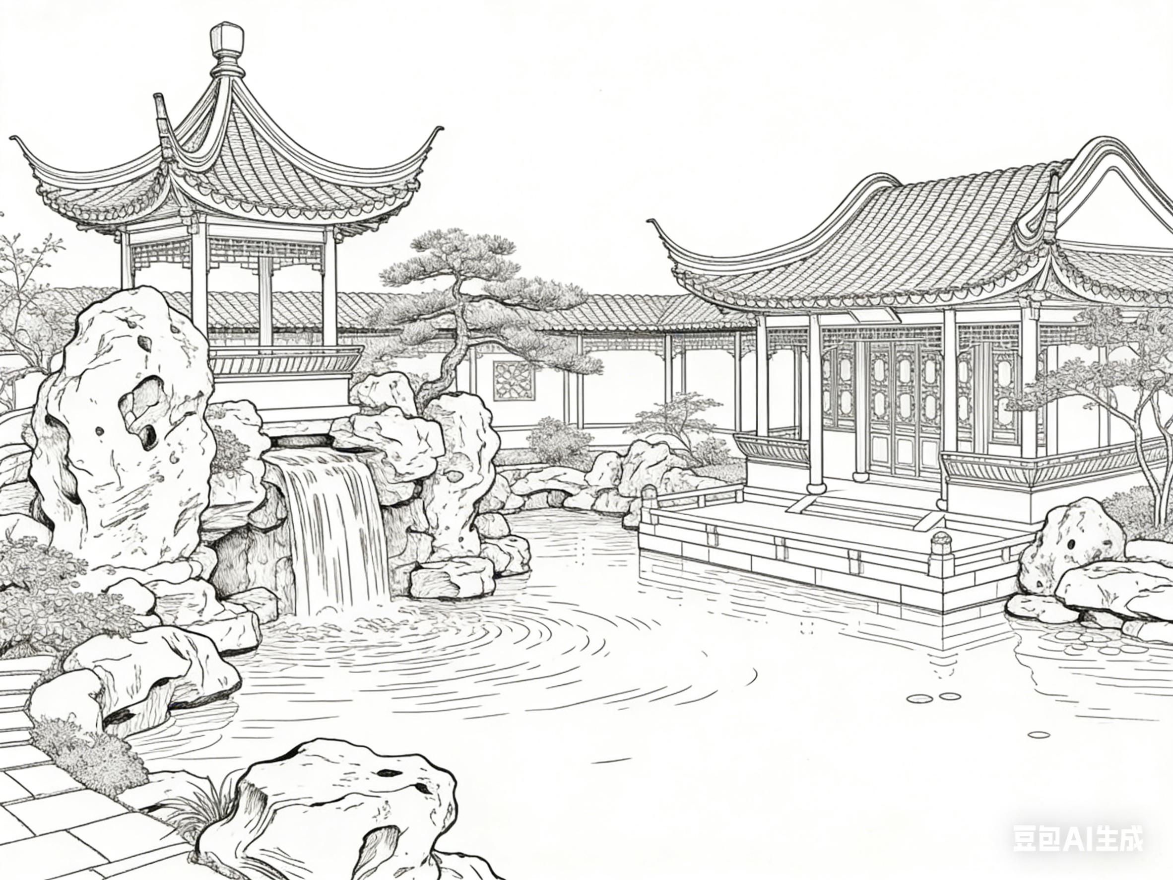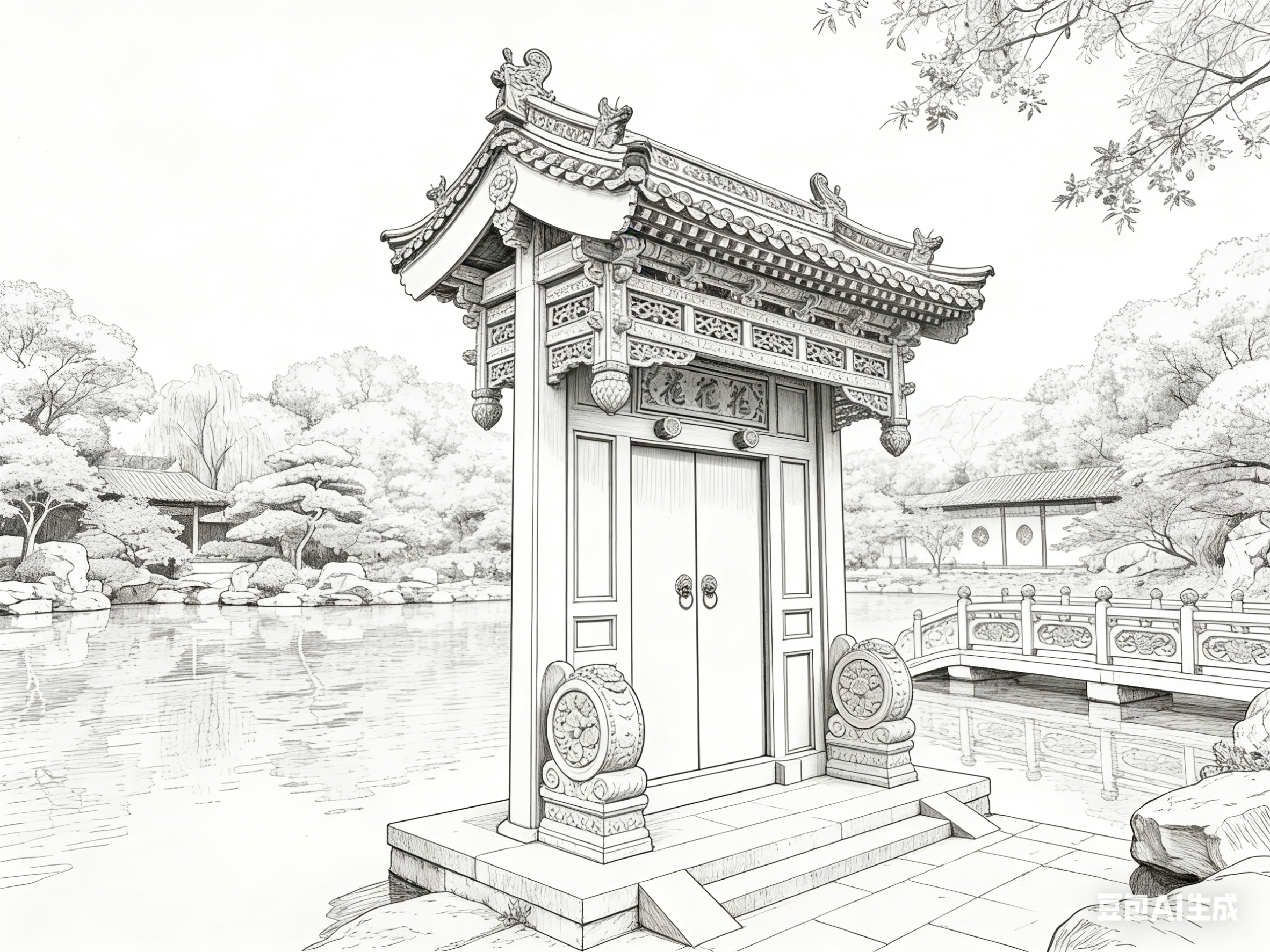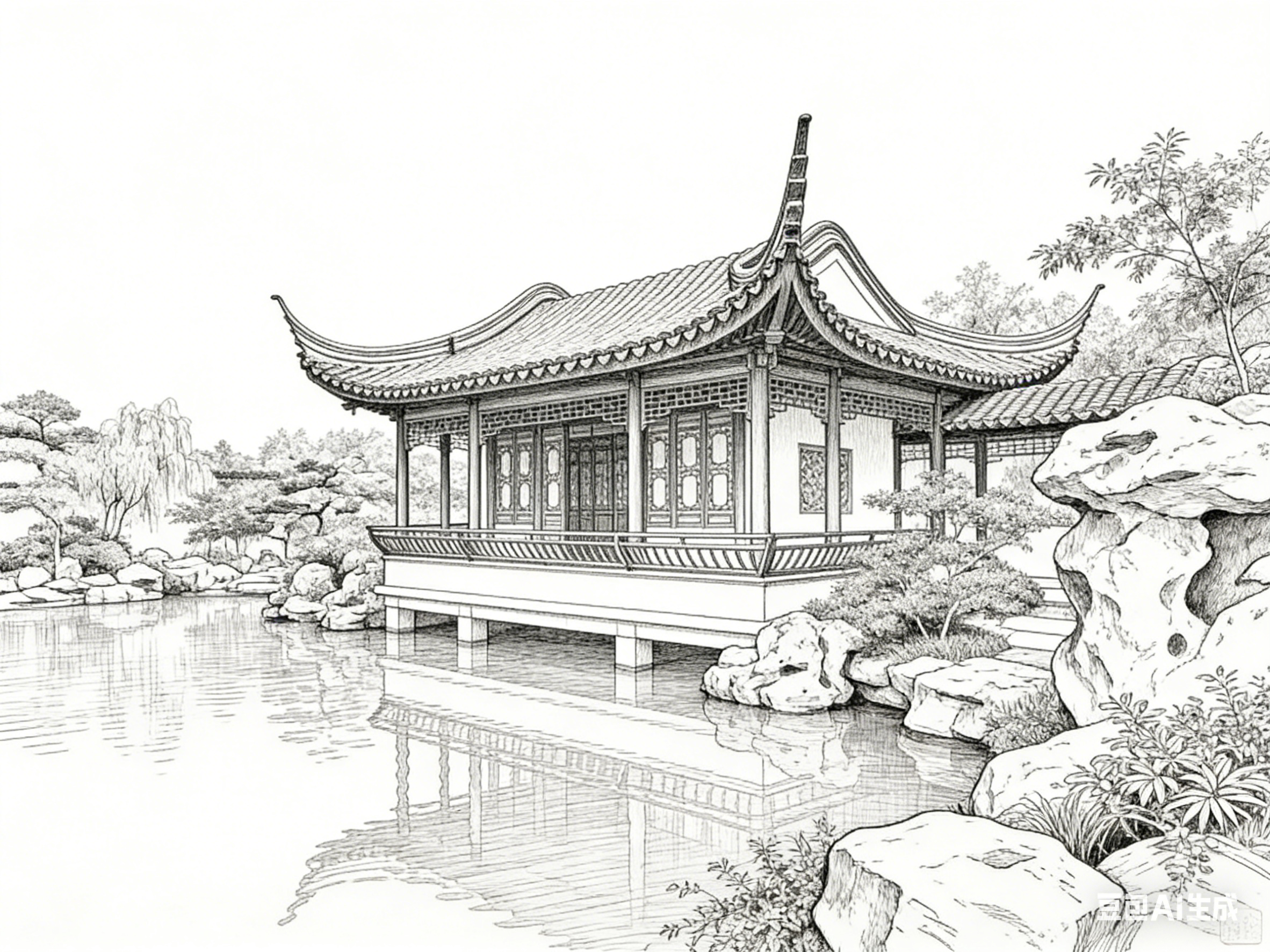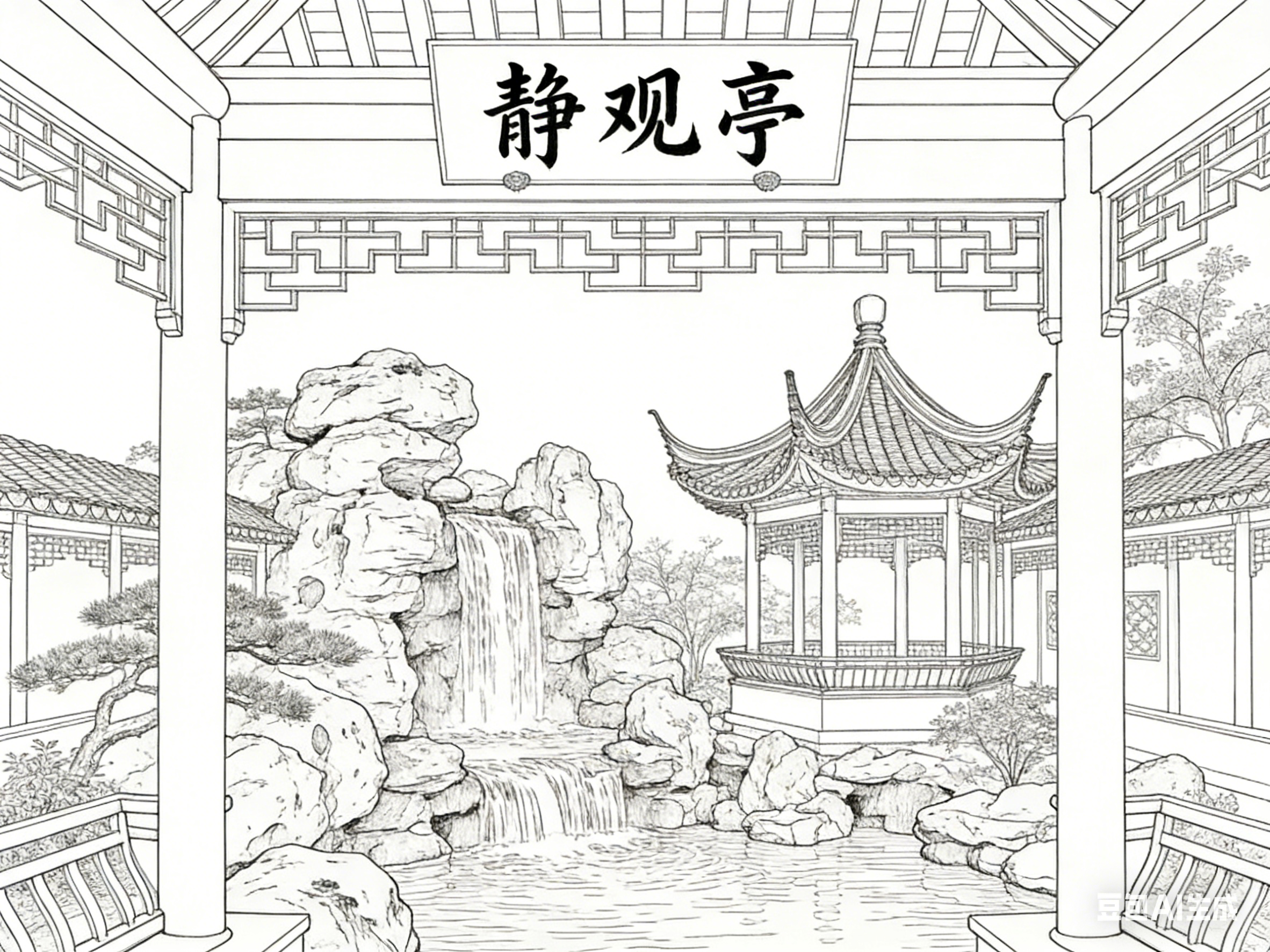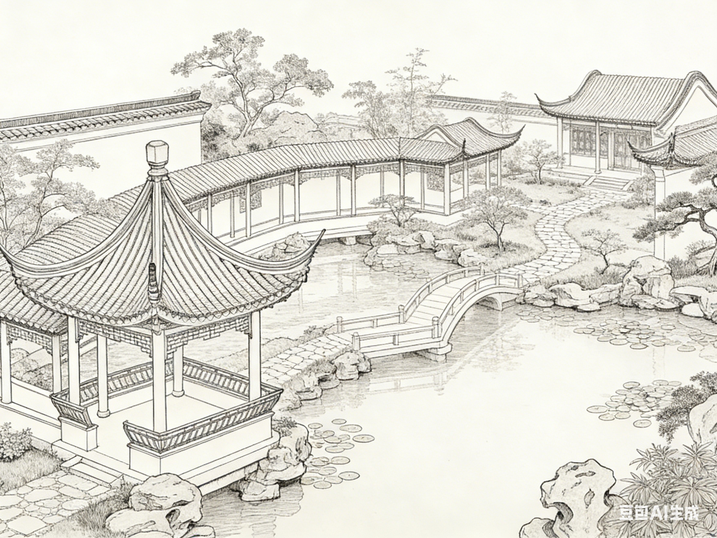东方美学体系中,白描线描与古建园林始终存在深层共鸣。线条作为绘画的基础语言,撑起古建园林的结构骨架;素色笔墨承载的韵致,呼应园林“虽由人作,宛自天开”的审美追求。二者相互滋养,将建筑的实用构造与艺术的精神意境熔于一炉,构筑起独属于东方的审美范式。白描线描不是对古建园林的简单复刻,而是以笔墨为媒介,对园林营造逻辑、空间哲学与文化底蕴的再诠释。读懂这种笔墨与营造的共生关系,便触到了东方美学的核心肌理。