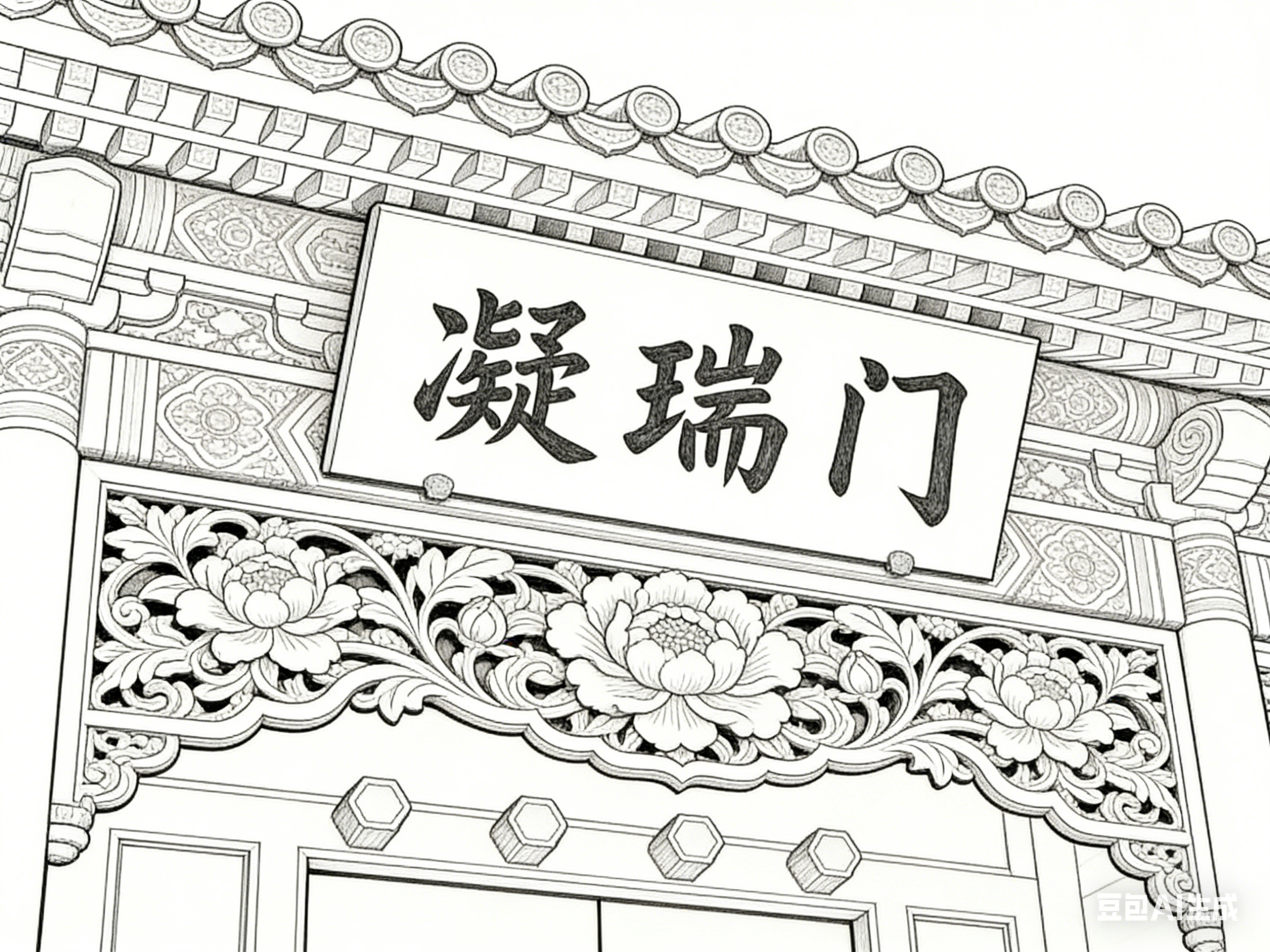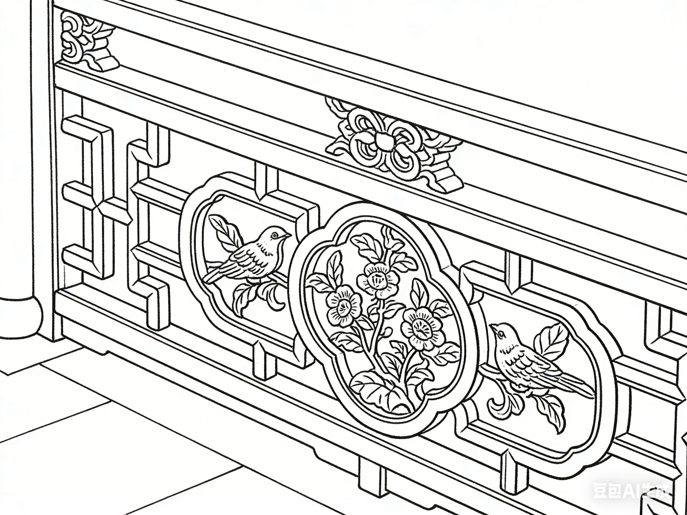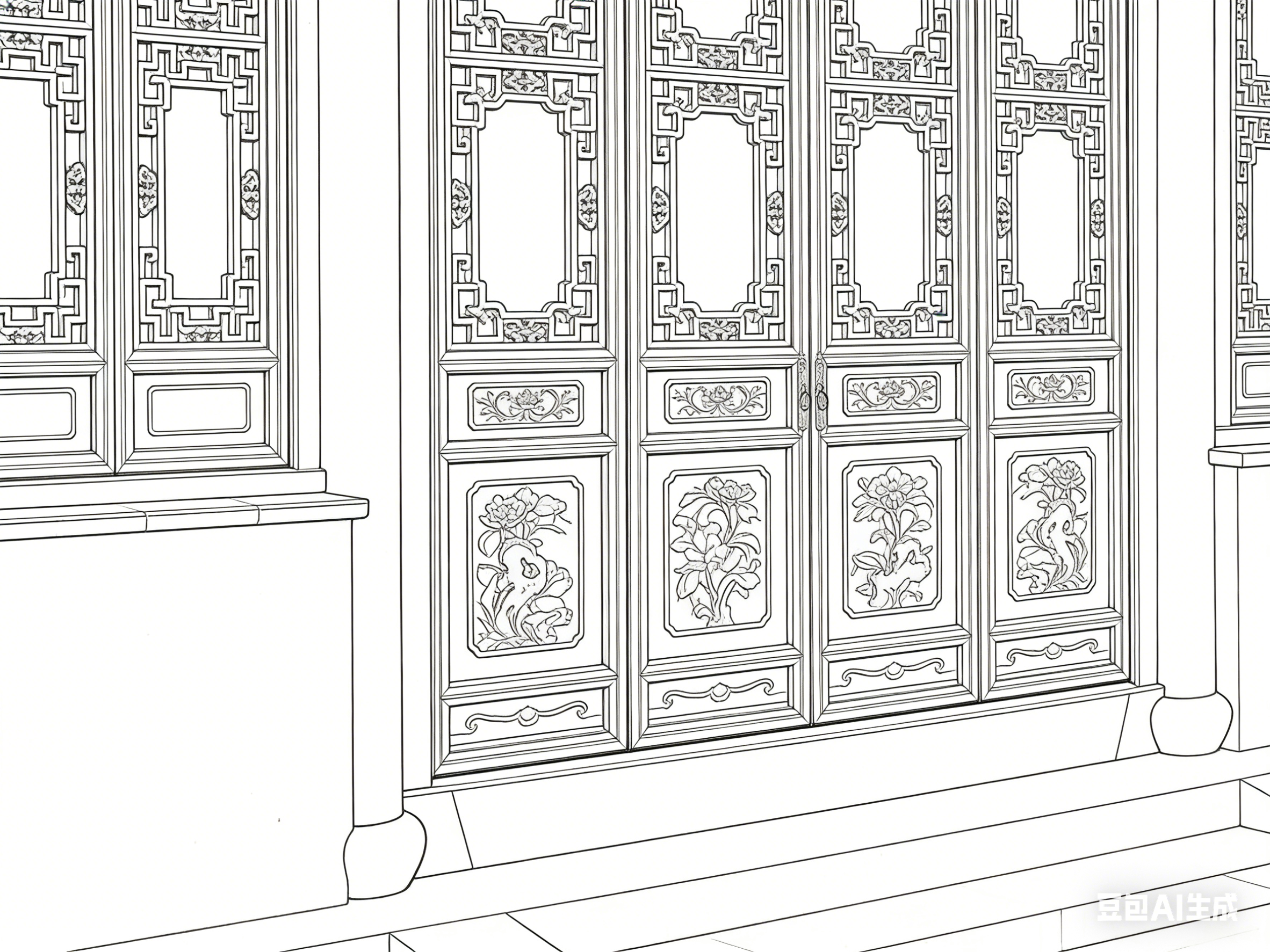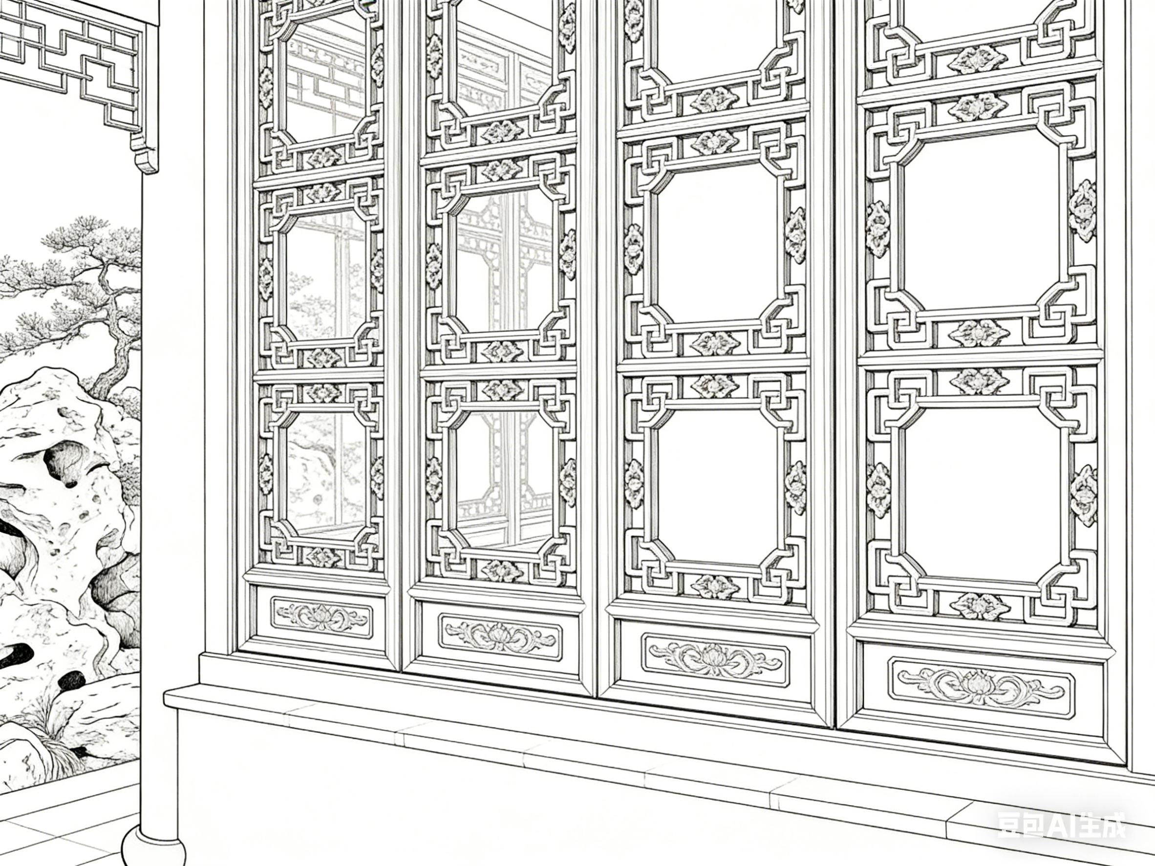 门窗的笔墨处理重细节与韵味。直棂窗线条笔直规整,疏密均匀,墨色统一,凸显简洁大气;花窗线条灵动多变,依纹样特点或曲或直,浓墨勾勒主纹,淡墨表现辅纹,镂空处留白,让窗格既精致又通透;隔扇门线条兼顾规整与灵动,框架线条粗重有力,门板纹样线条细腻,二者形成对比,展现其装饰与分隔的双重功能。