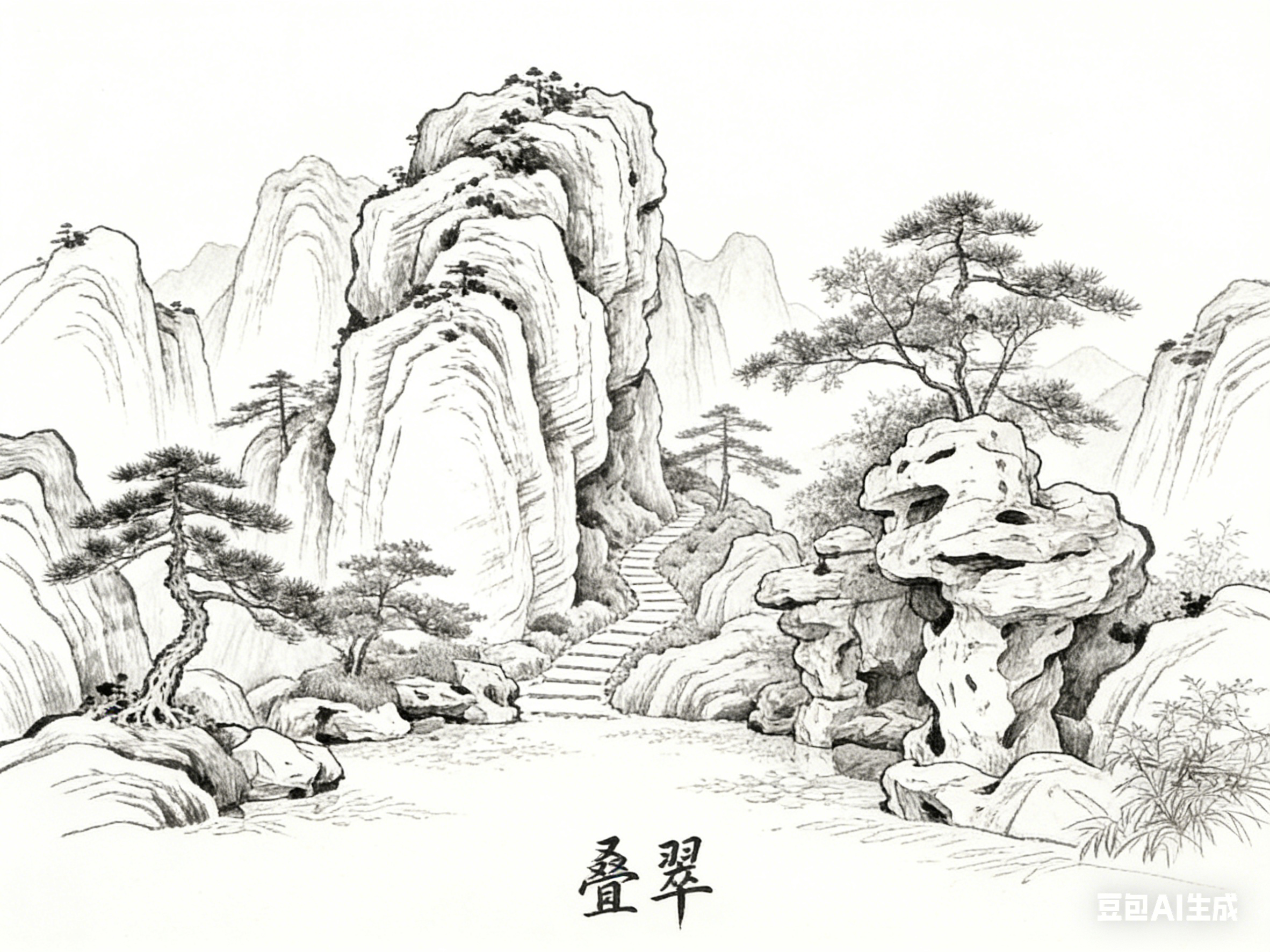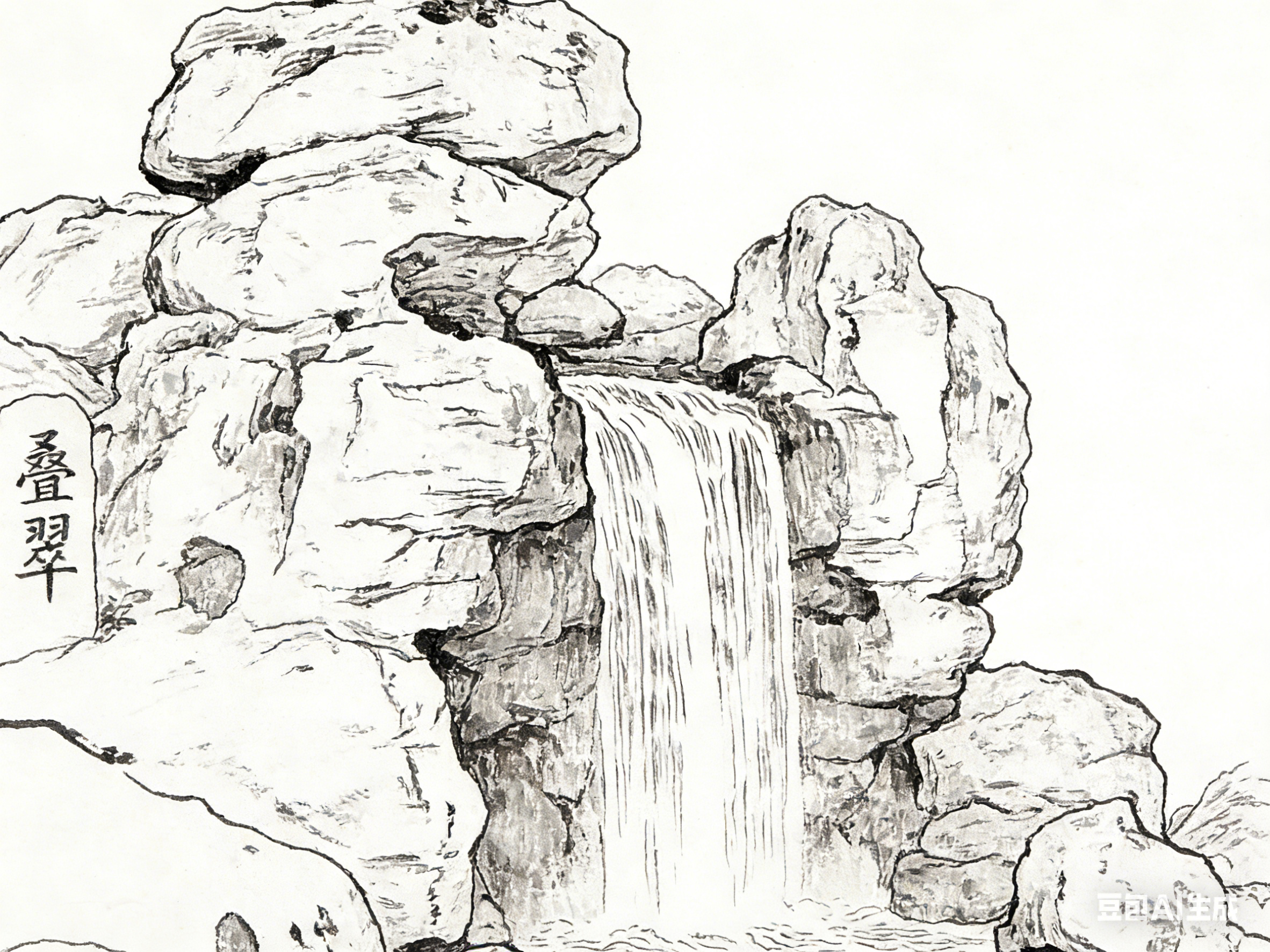 石材构件的线描的则以粗重、刚硬的线条勾勒轮廓,内部以稀疏线条或干笔皴擦表现石质的厚重粗糙。假山的线条多为曲折顿挫,笔触苍劲有力,通过线条的交织缠绕,展现山石“瘦皱漏透”的特质;台基的线条规整厚重,横竖线条笔直沉稳,凸显其承载建筑的坚实功能。砖瓦的排列以规整的短线、平行线呈现,线条细密均匀,强化其秩序感与堆叠质感,瓦片的弧线则柔和灵动,中和整体的厚重感。