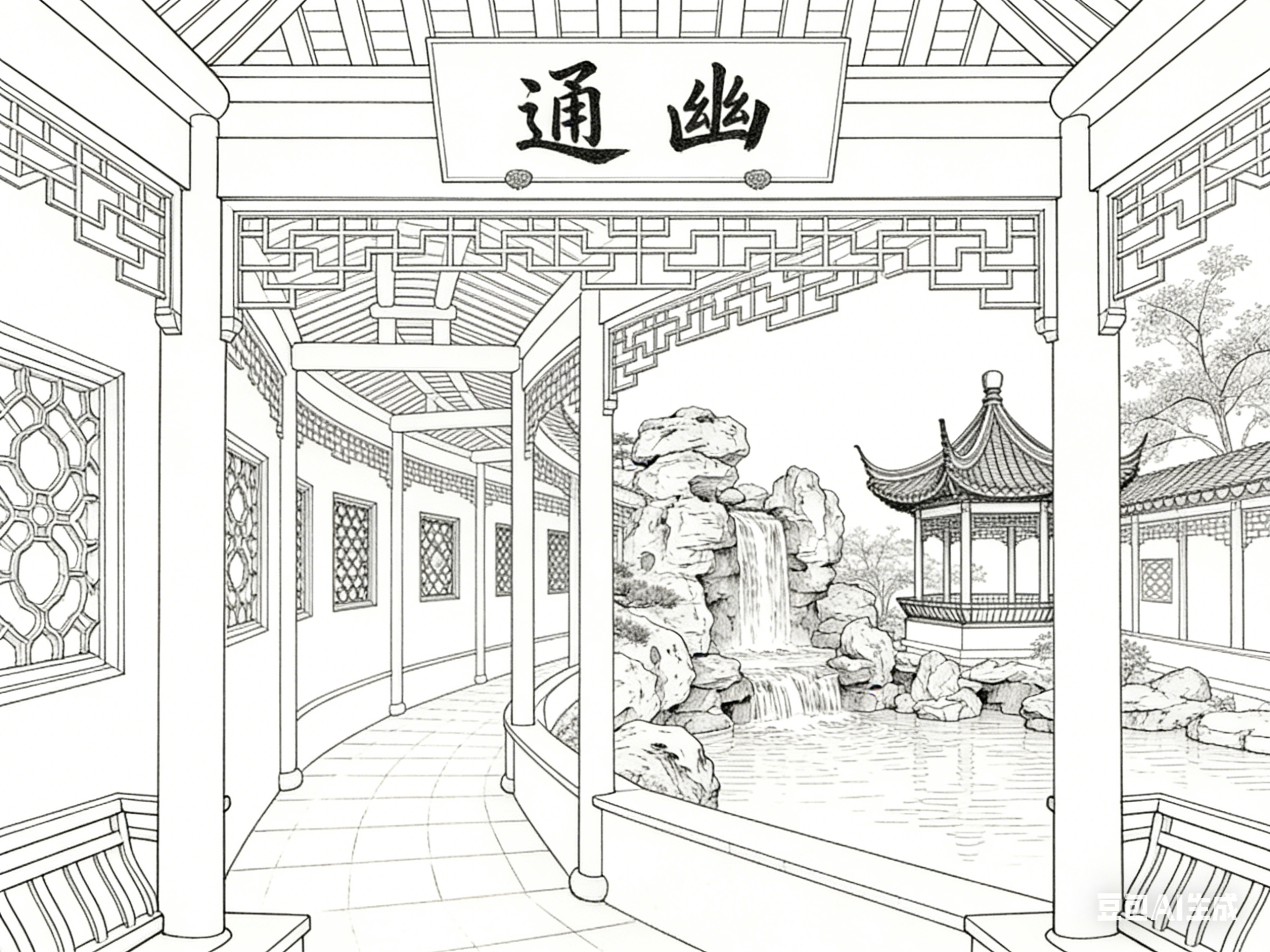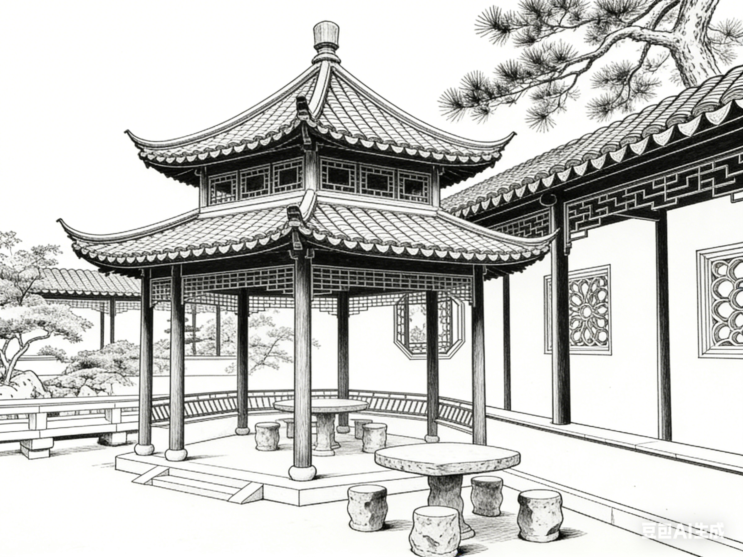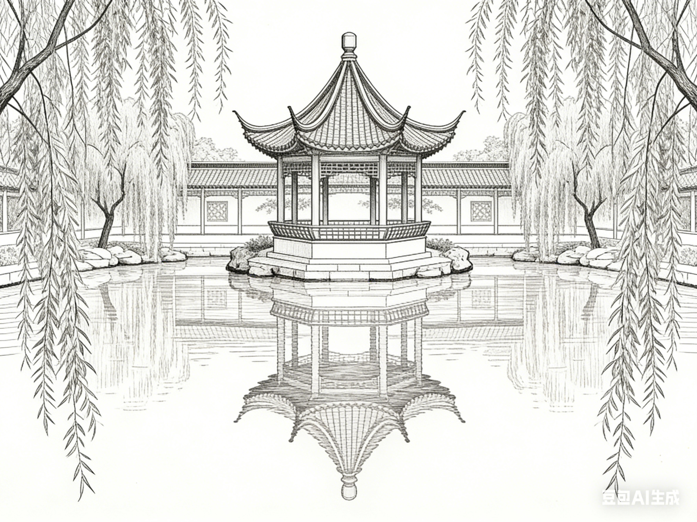 以线为骨,让古建园林的形制得以屹立千年;以素为韵,让园林意境得以流转万古。白描线描与古建园林的共生关系,是东方美学最动人的表达之一。线条的转折提按间,藏着营造的智慧;素墨的虚实变化中,含着文化的底蕴;笔墨的取舍之间,载着文人的情怀。这种融合超越了艺术与建筑的边界,成为一种承载东方哲学、传递文化精神的生活方式与审美追求。