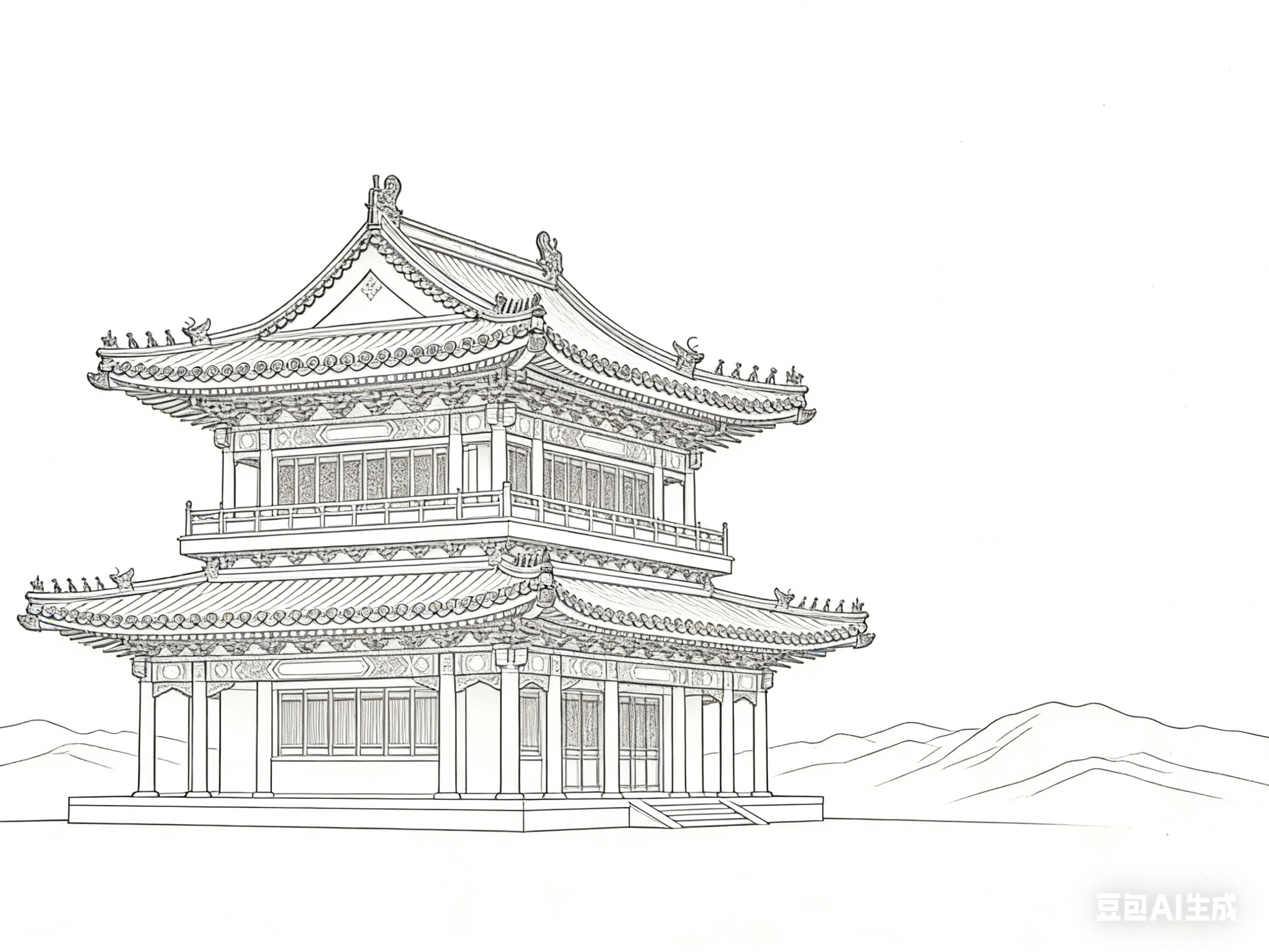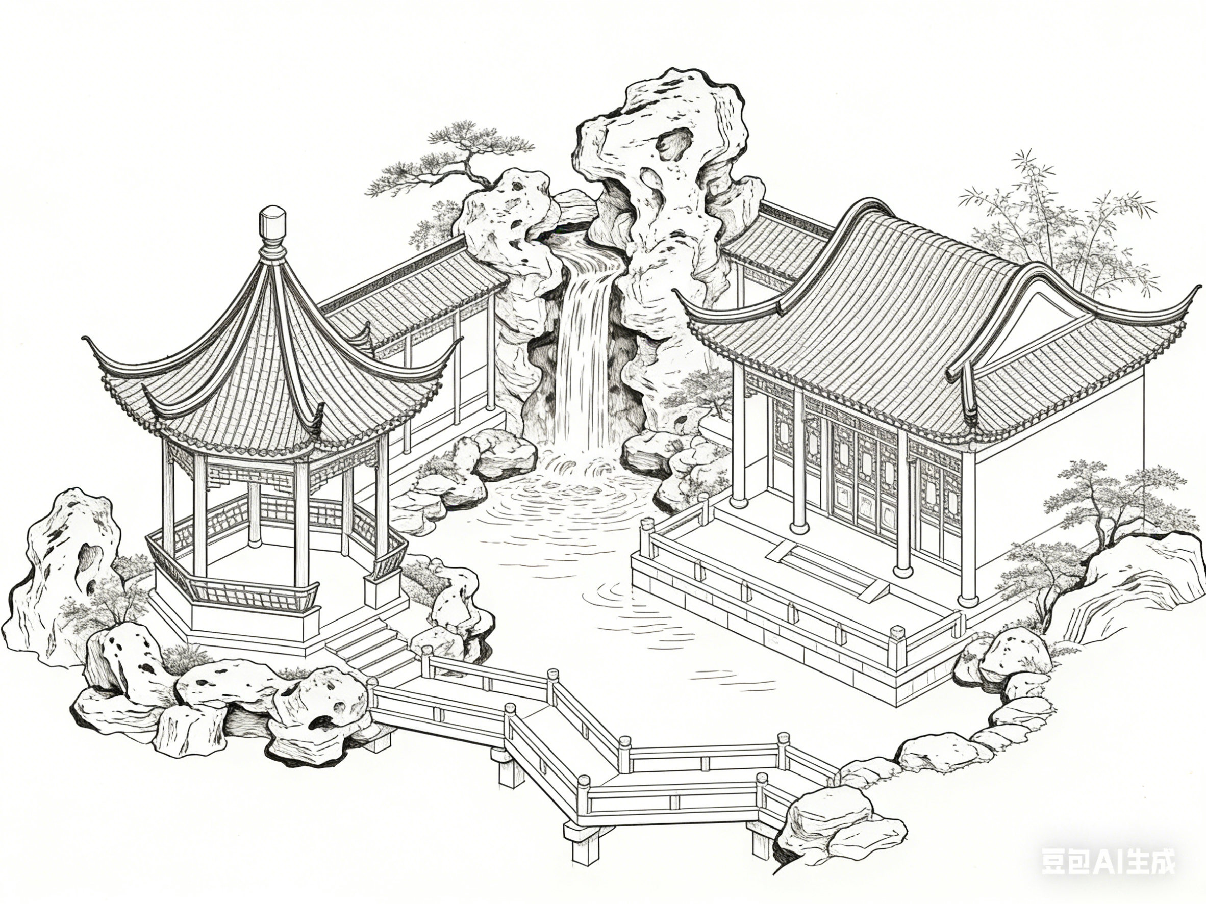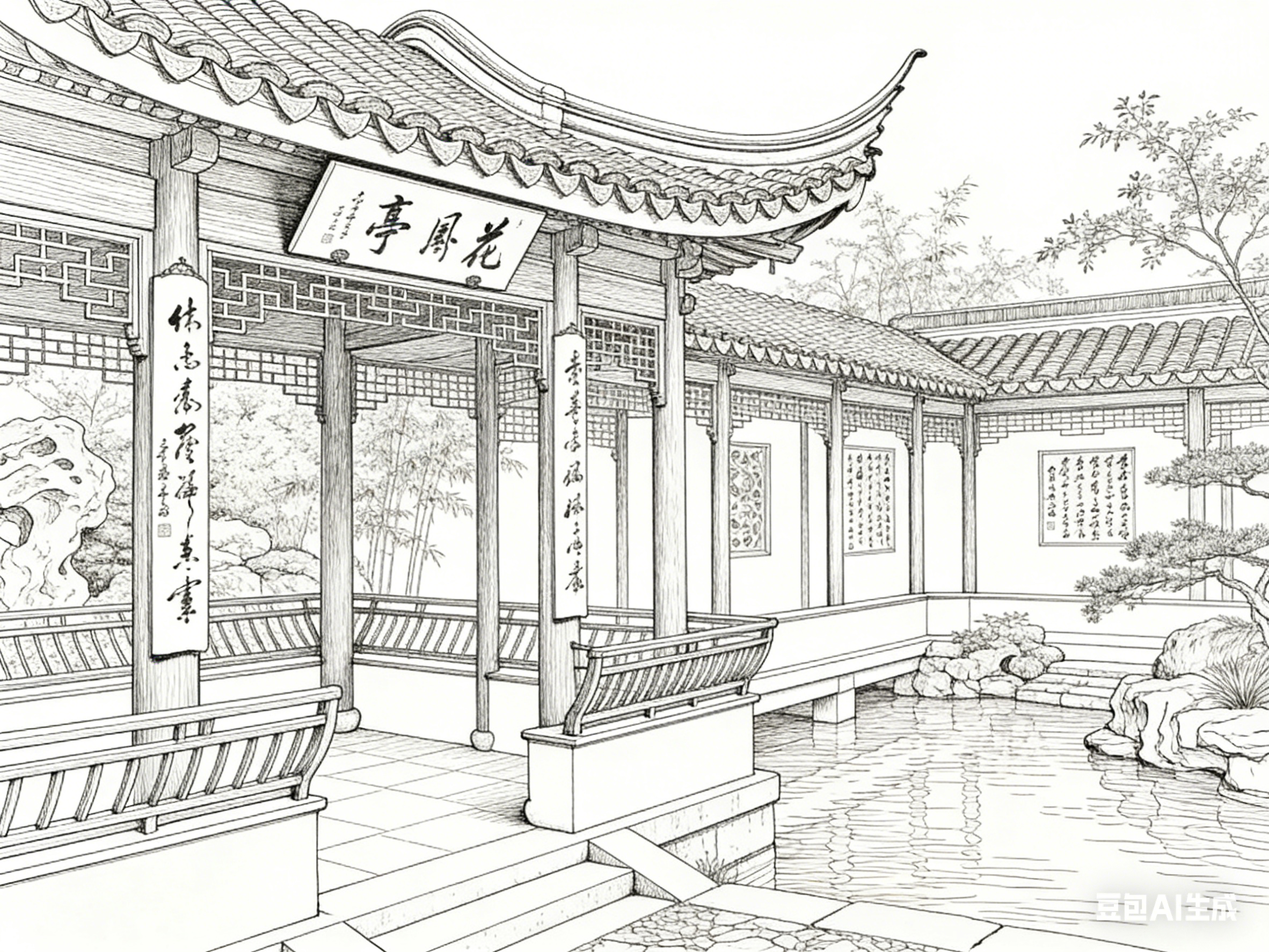 以线为骨,让古建园林的形制得以屹立千年;以素为韵,让园林意境得以流转万古。白描线描与古建园林的共生关系,是东方美学最动人的表达之一。线条的转折提按间,藏着营造的智慧;素墨的虚实变化中,含着文化的底蕴;笔墨的取舍之间,载着文人的情怀。这种融合超越了艺术与建筑的边界,成为一种承载东方哲学、传递文化精神的生活方式与审美追求。