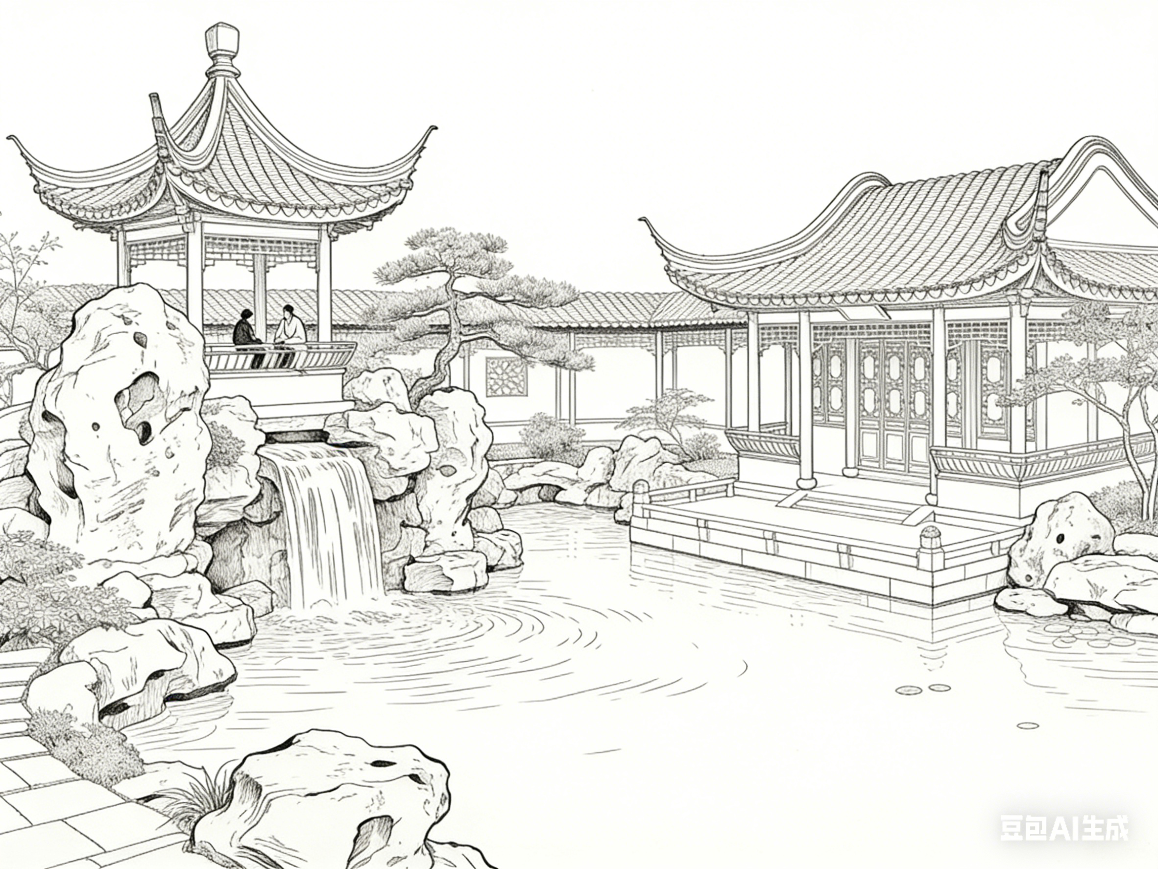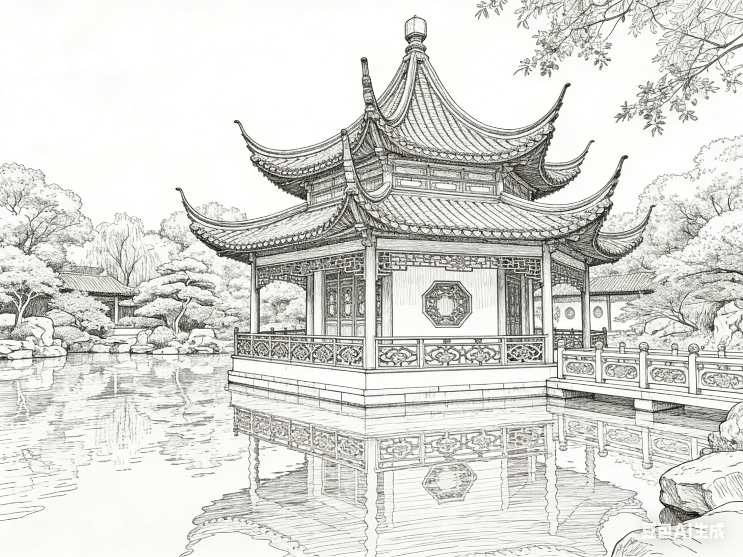这种艺术重构让白描既尊重园林的本真形态,又赋予其更高的审美价值。白描舍弃了繁琐细节,却保留了园林的灵魂内核,让建筑的结构美、景物的自然美与文人的精神美融为一体。观者通过白描作品,既能感受到古建园林的形制之美,又能领悟其深层的文化意境,实现从视觉欣赏到精神共鸣的升华。