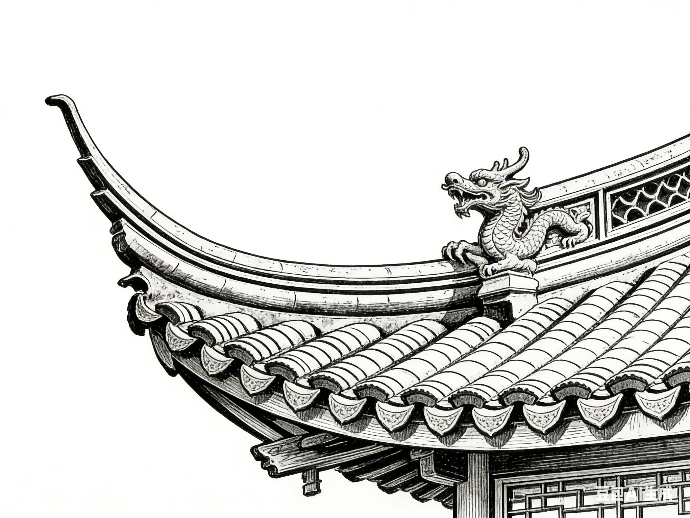 线描技法影响着古建园林的最终形态。屋顶的曲线、檐角的翘起、窗棂的纹样,都需通过线描预先设定,线条的韵律直接决定建筑的整体气度。唐代建筑雄浑大气,线描多采用刚劲流畅的长线,屋顶线条平缓舒展,尽显庄重之态;明清建筑细腻繁复,线描线条精巧多变,构件刻画细致入微,传递出雅致之风。线描作为营造的前置环节,早已为古建园林注入了美学基因。