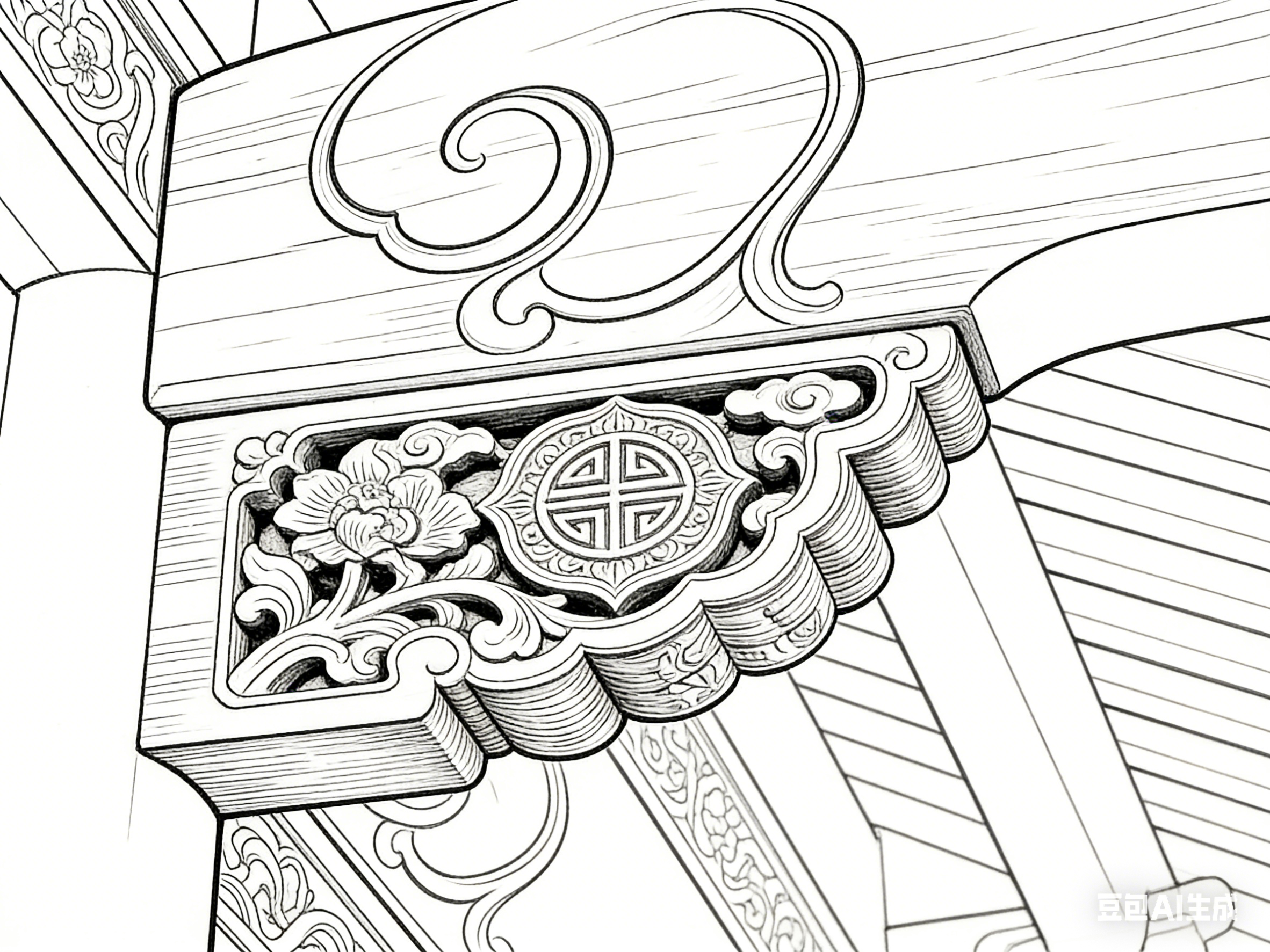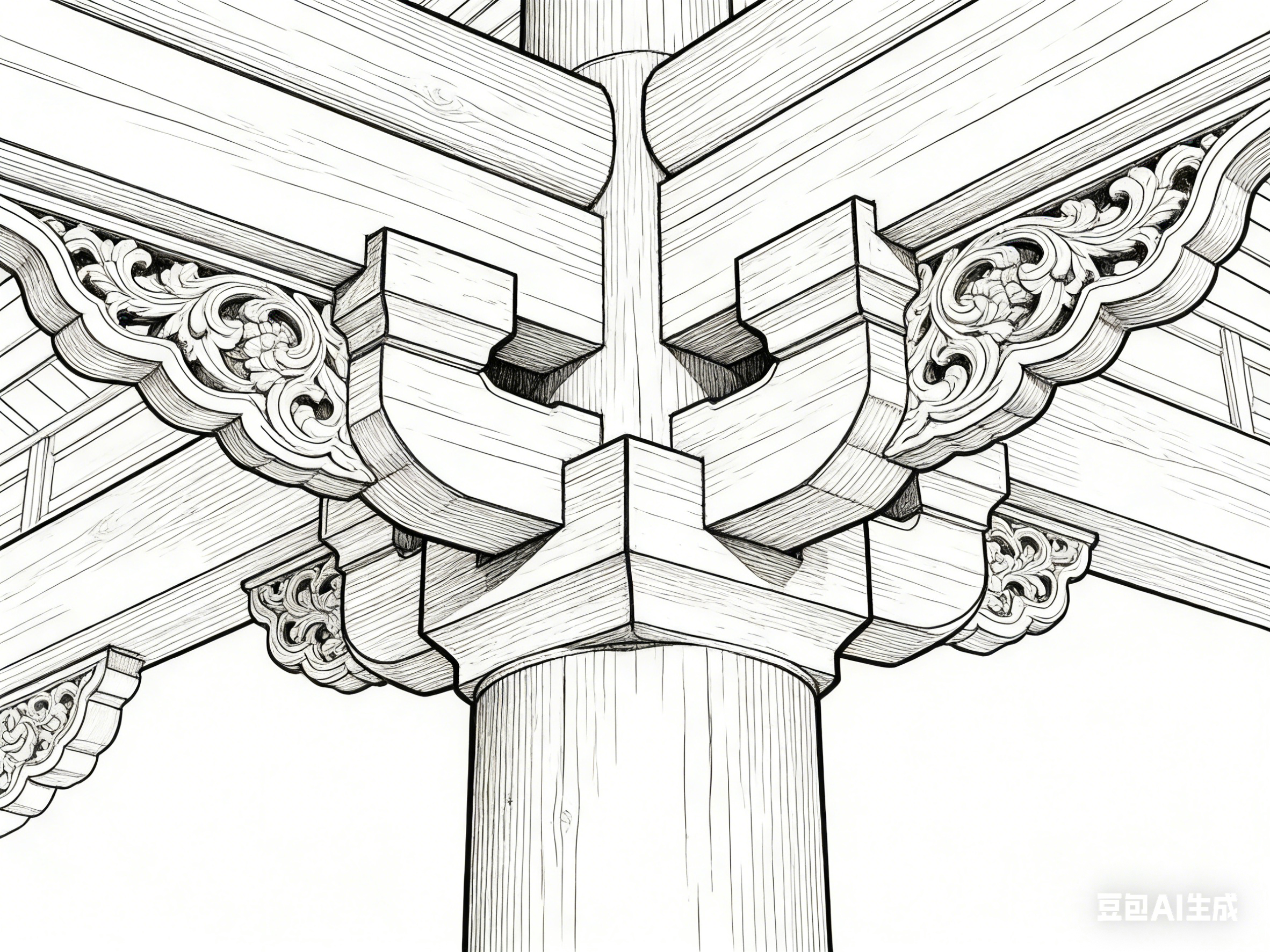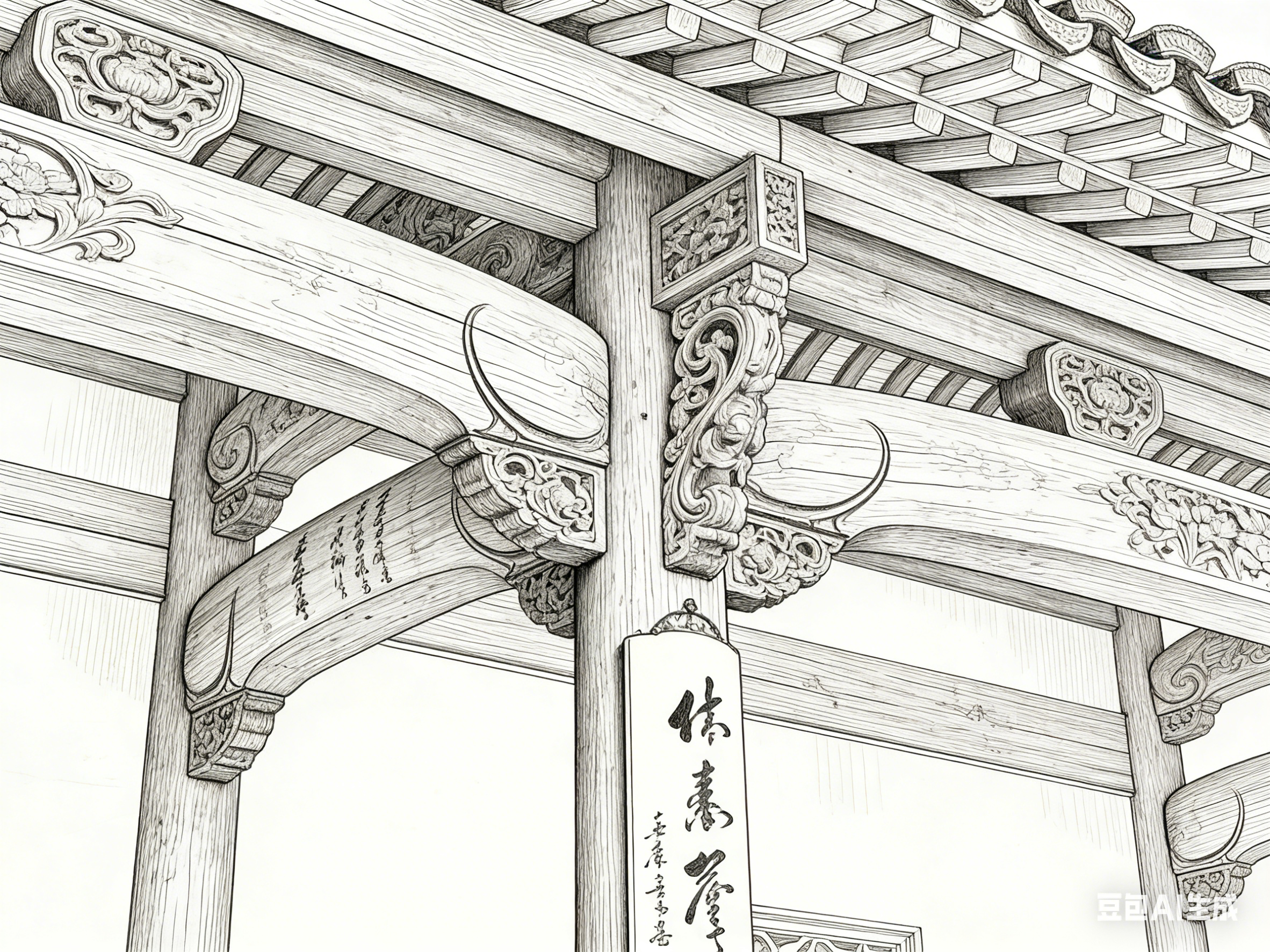 古建园林的各类构件,通过线描的差异化处理呈现独特质感。木质构件的纹理,以流畅且略带顿挫的线条表现,笔锋转折自然,既凸显木材的温润坚韧,又展现纹理的自然肌理。柱子的线条挺拔有力,自上而下粗细均匀,偶有细微顿挫,暗示木材的承重质感;梁枋的线条则兼顾弧度与力度,贴合其结构形态,传递出沉稳大气的气质。