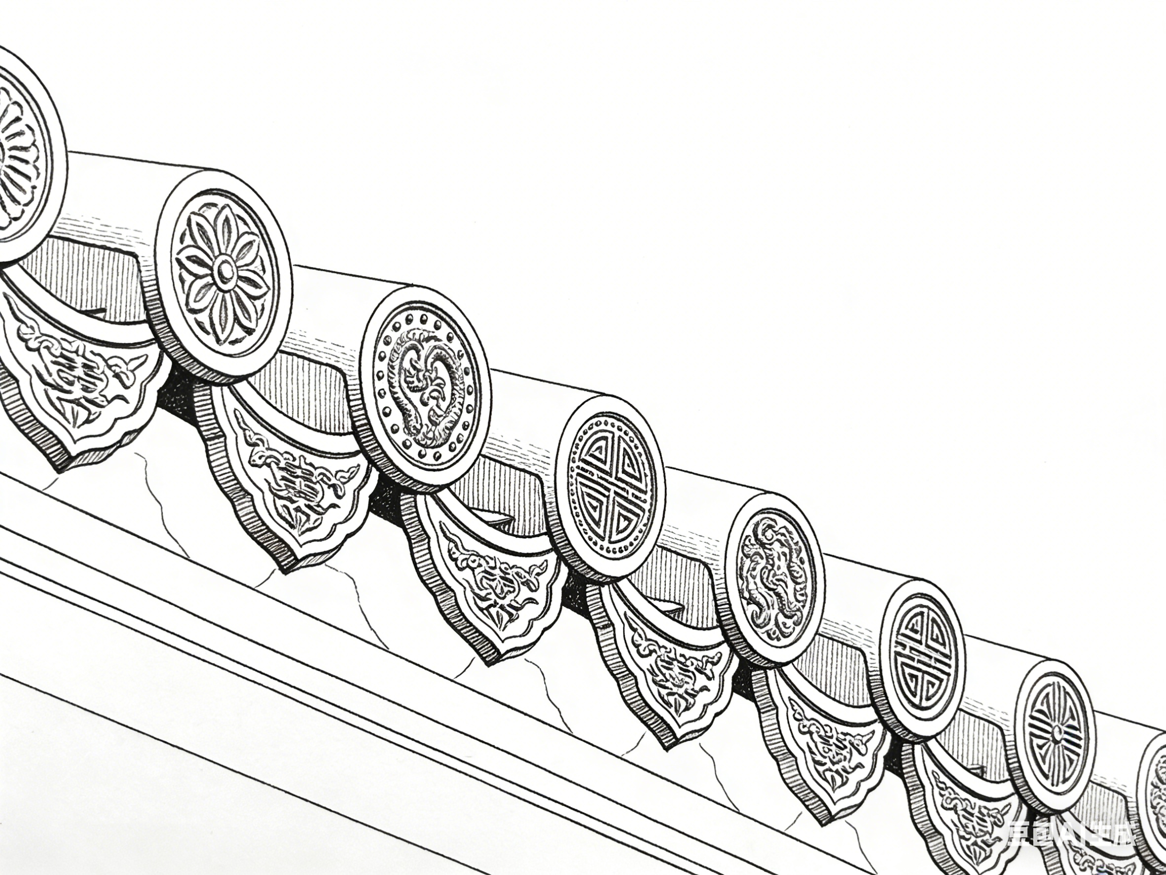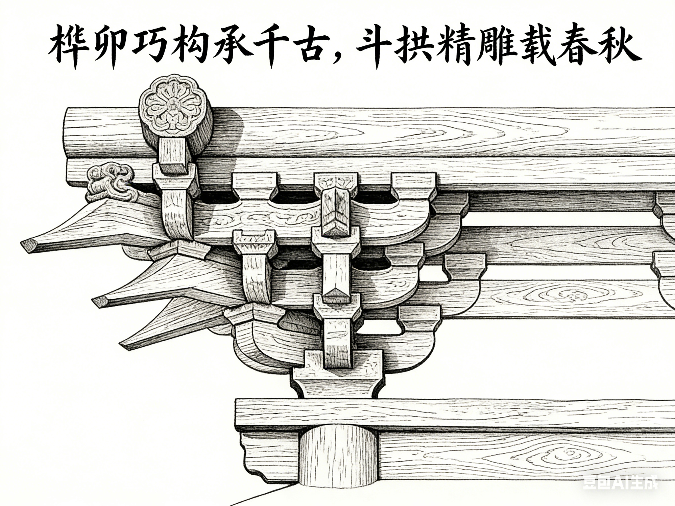 笔墨技法与古建园林构件的深度适配,是实现美学共生的关键。不同构件的结构特质、材质质感与审美功能,对应不同的笔墨处理方式,让笔墨既服务于构件的形态表现,又强化其审美价值。这种适配不是简单的技法套用,而是基于对构件与笔墨的双重理解,实现形式与内容的统一。