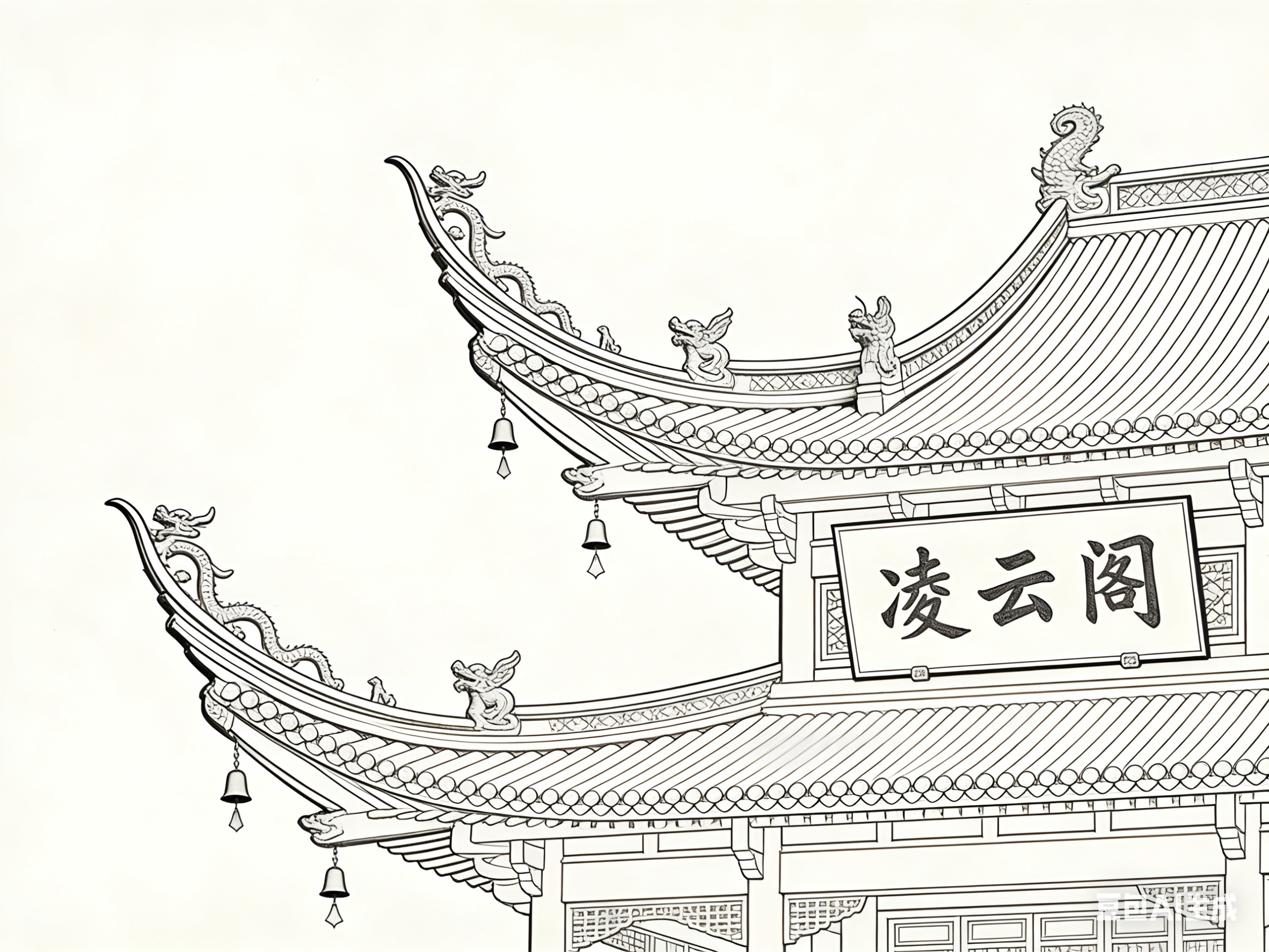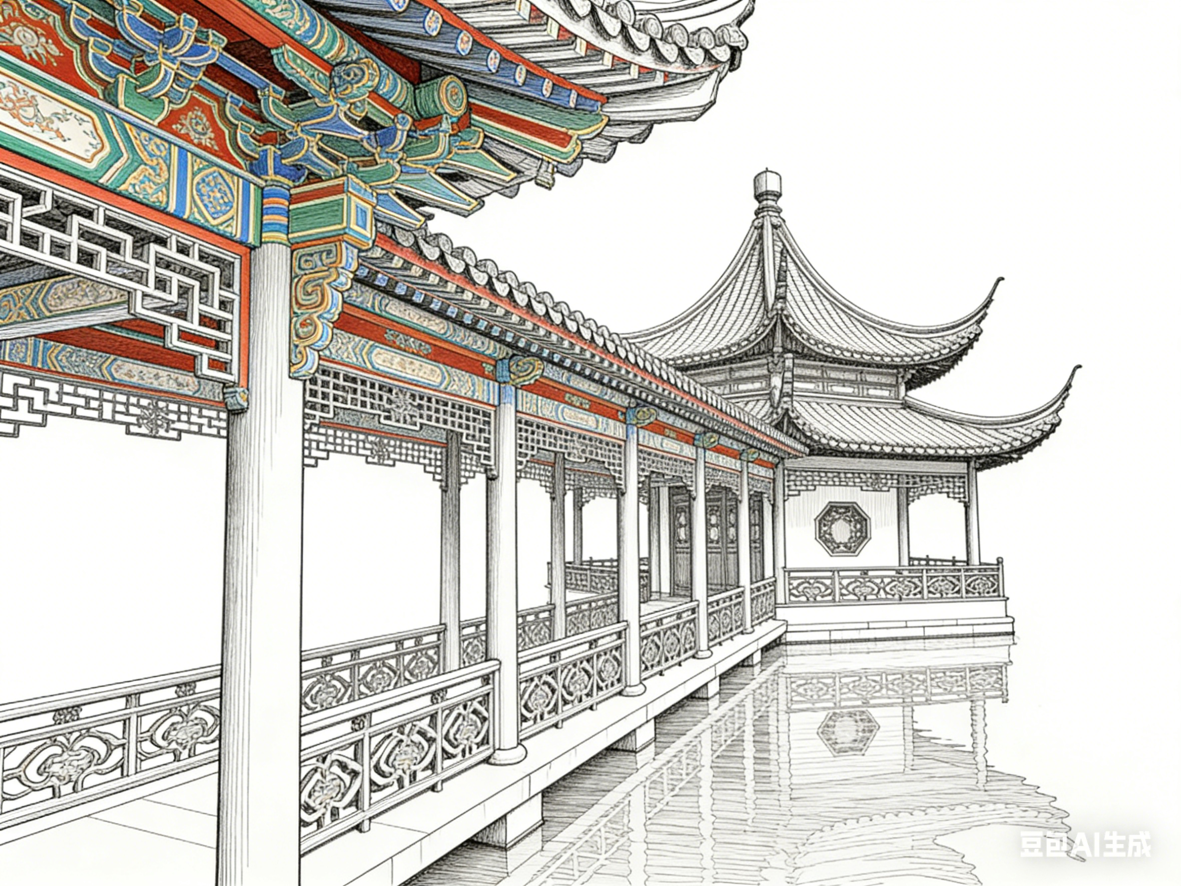 线描与白描并非孤立存在,二者相互补充、共生共荣,共同诠释古建园林的美学内涵。线描为骨,奠定画面的结构与形态,确保建筑构件的精准与空间层次的清晰;白描为韵,赋予画面精神与意境,让线条摆脱纯粹的造型功能,拥有情感与温度。二者的融合,实现了“骨劲韵足”的艺术效果,让古建园林的表现既规整严谨,又灵动飘逸。