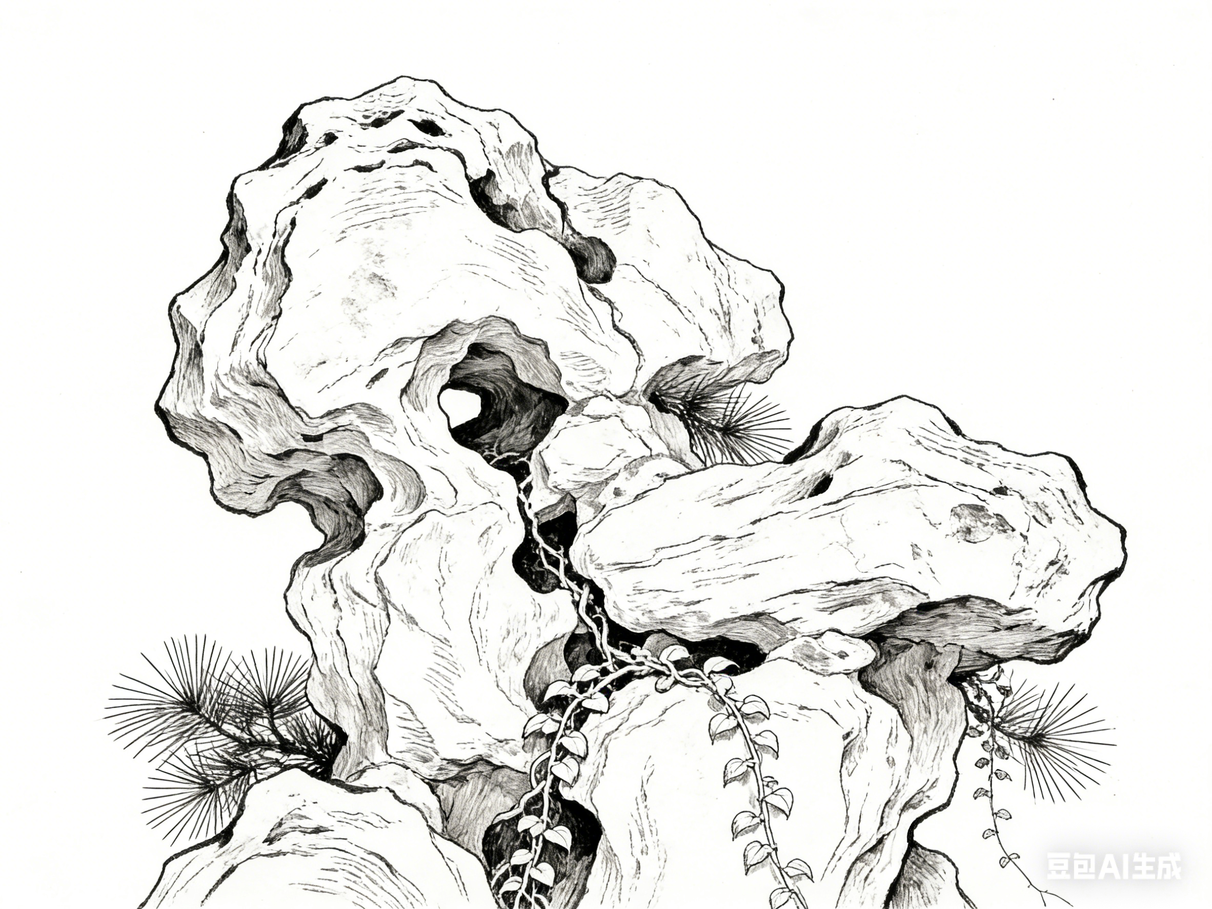 白描的取舍遵循“重神轻形”的原则。描绘建筑时,不刻意刻画砖瓦的每一处细节,而是提炼梁架、飞檐、窗棂的核心形态,用线条勾勒其整体气度;描绘山石时,不纠结于每一处纹路,而是捕捉“瘦皱漏透”的核心特质,以顿挫笔触表现其苍劲神韵;描绘花木时,不细数枝叶的数量,而是提炼枝干的走势与花叶的姿态,传递其生机与意趣。