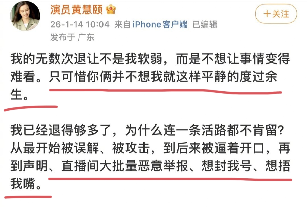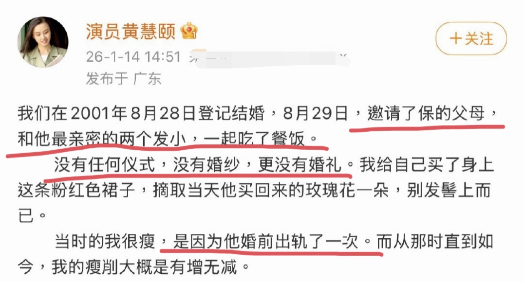 1月14日,黄慧颐公开发文称自己的直播账号被举报封禁了,怀疑是保剑锋那边的人在操弄,所以她决定不再忍耐,公开当年和保剑锋隐婚的往事。