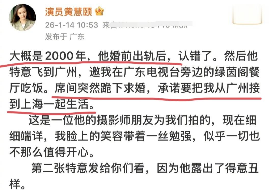据黄慧颐透露,该照片拍摄于广东电视台附近,当时保剑锋婚前已经出轨过一次,为了挽留她,向她求婚了,还承诺会把她从广东接到上海生活。