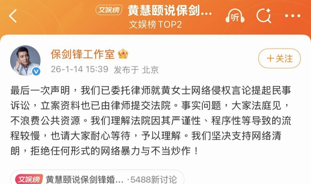对于黄慧颐的指控,保剑锋没有出来对峙和反驳,他选择让团队出来发声,工作室发布了声明,表示已经向法院提起诉讼,要提告黄慧颐女士。