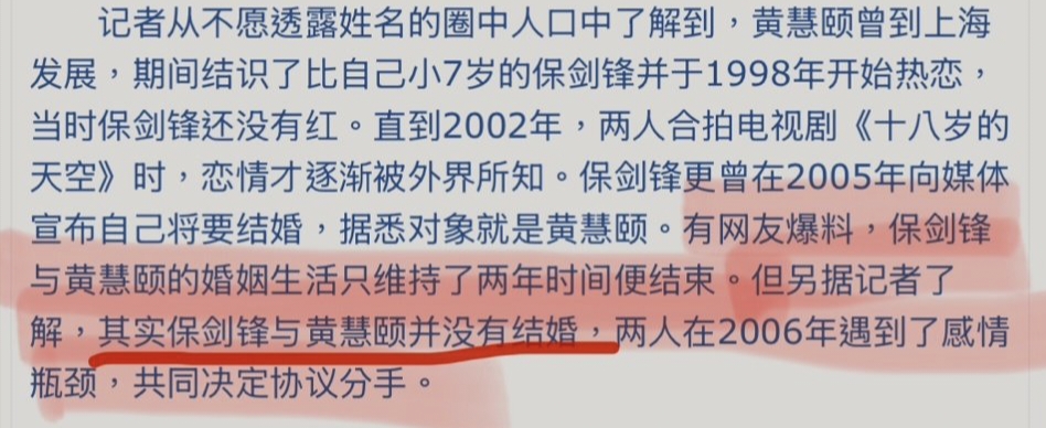 但有记者表示,其实保剑锋和黄慧颐并没有结婚,后来感情遇到瓶颈,双方决定协议分手。