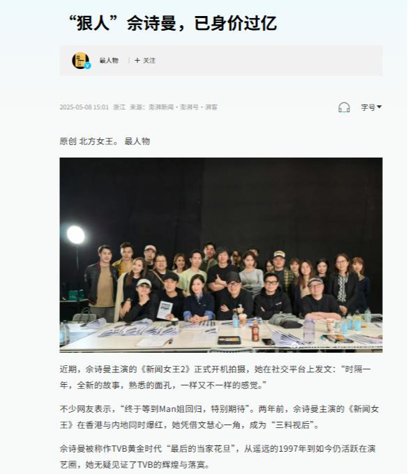 这种态度与她饰演的《新闻女王》角色形成有趣对照,剧中主播文慧心追求事业巅峰,剧外的佘诗曼选择回归家庭与自我规划。