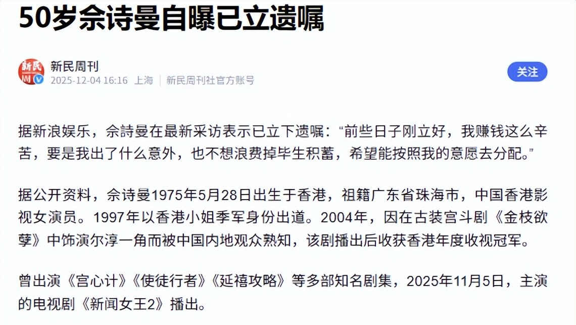 对于自己的决定,佘诗曼明确表示:“遗嘱就是我最真实的人生剧本。”