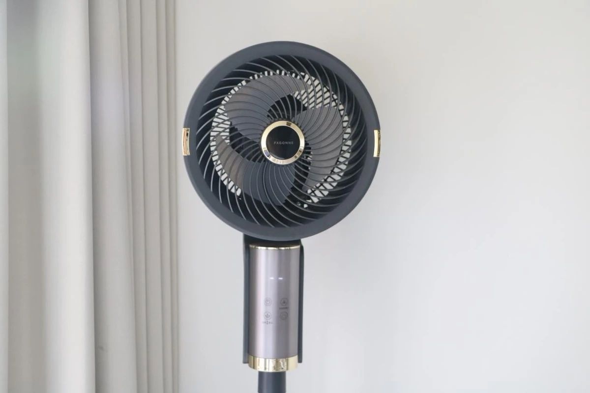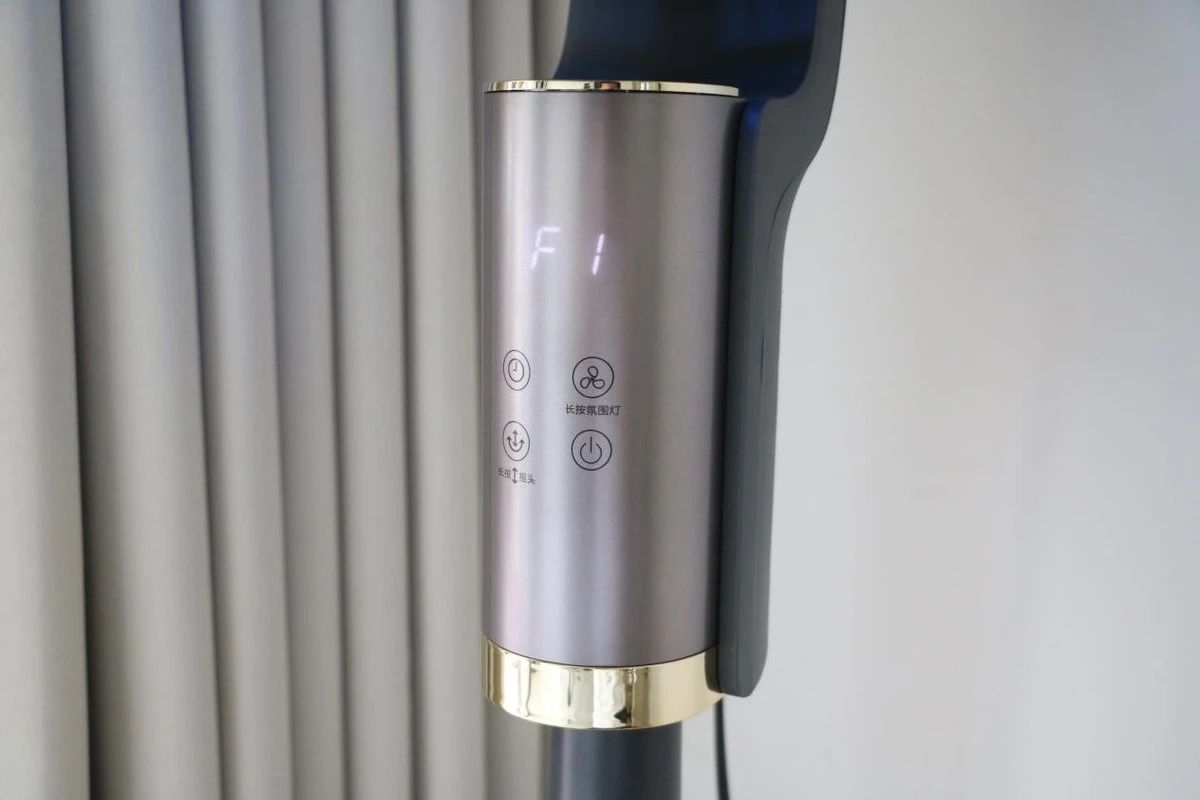 宫菱VEV采用哑光灰机身+黑色底盘+金属杆的工业风设计,没有花哨的线条,却透出高级感。支撑杆支持840mm-1100mm自由升降,通过旋转螺母即可锁定高度。无论是放地毯上直吹,还是调高匹配沙发或书桌,都能无缝适配。实测底座厚重稳固,即便开到最大档也无晃动问题,安全性拉满。