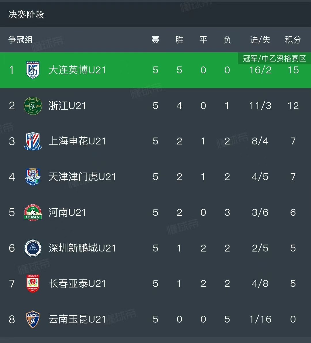 五轮之后,U-21联赛积分榜如下。争冠组:1、大连英博15分;2、浙江12分;3、上海申花7分;4、天津津门虎7分;5、河南6分;6、深圳新鹏城5分;7、长春亚泰5分;8、云南玉昆0分。