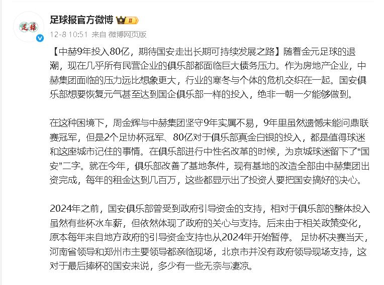 虽然他多次表示,未来还会准备投资几千亿日元来扶持球队,争取未来夺得几个中超冠军,这是他想看到的结果。当足协强制推行中性名政策,中赫集团顶着压力保留国安两个字,这不是固执,这是对足球最纯粹的热爱!但这份热爱,在现行体制下究竟能支撑多久?当周金辉们的心血被政策随意践踏时,中国足球还配拥有这样的投资人吗?你们认为北京国安明年会夺得中超冠军吗?在亚冠大杀四方吗?你们还爱北京国安吗?