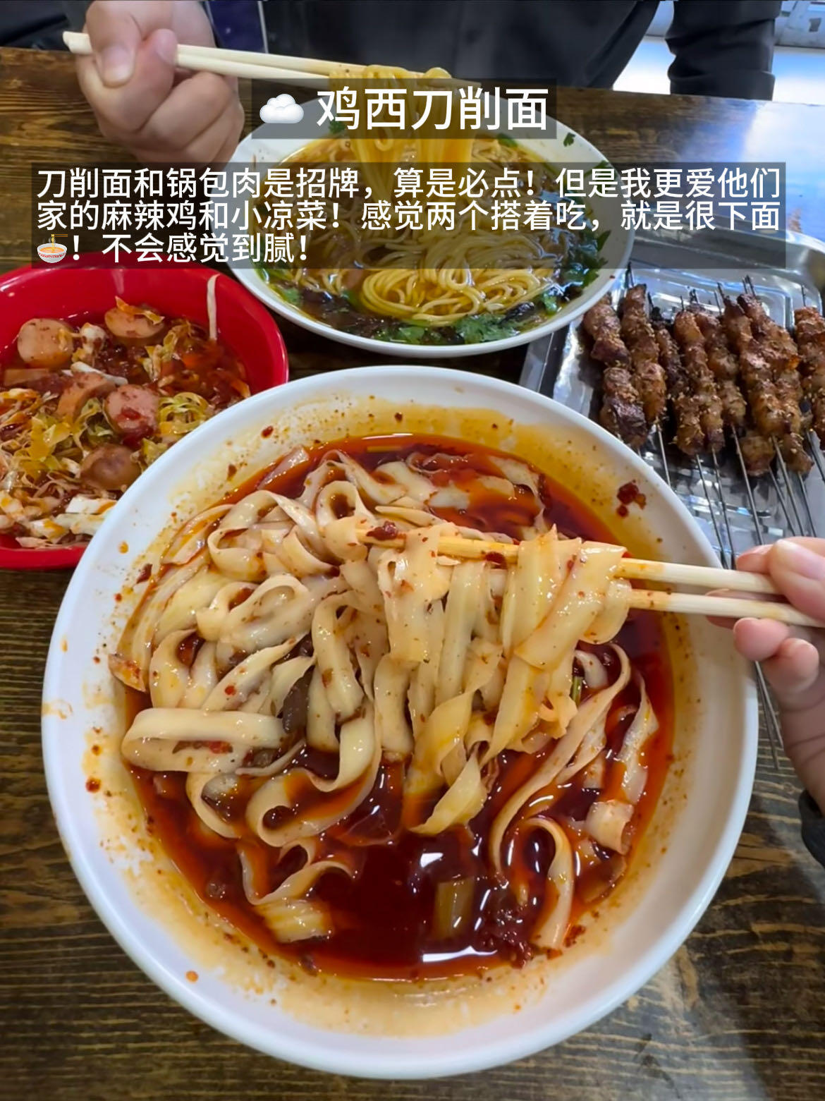 ✔️鸡西刀削面:刀削面和锅包肉是招牌,算是必点!但是我更爱他们家的麻辣鸡和小凉菜!感觉两个搭着吃,就是很下面🍜!不会感觉到腻!