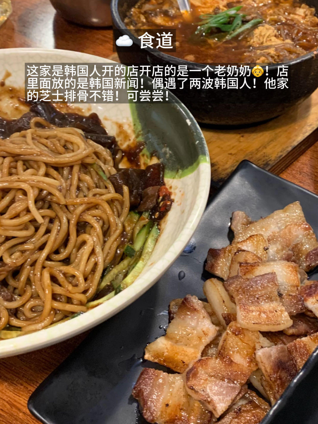 ✔️食道:这家是韩国人开的店开店的是一个老奶奶👵!店里面放的是韩国新闻!偶遇了两波韩国人!他家的芝士排骨不错!可尝尝!