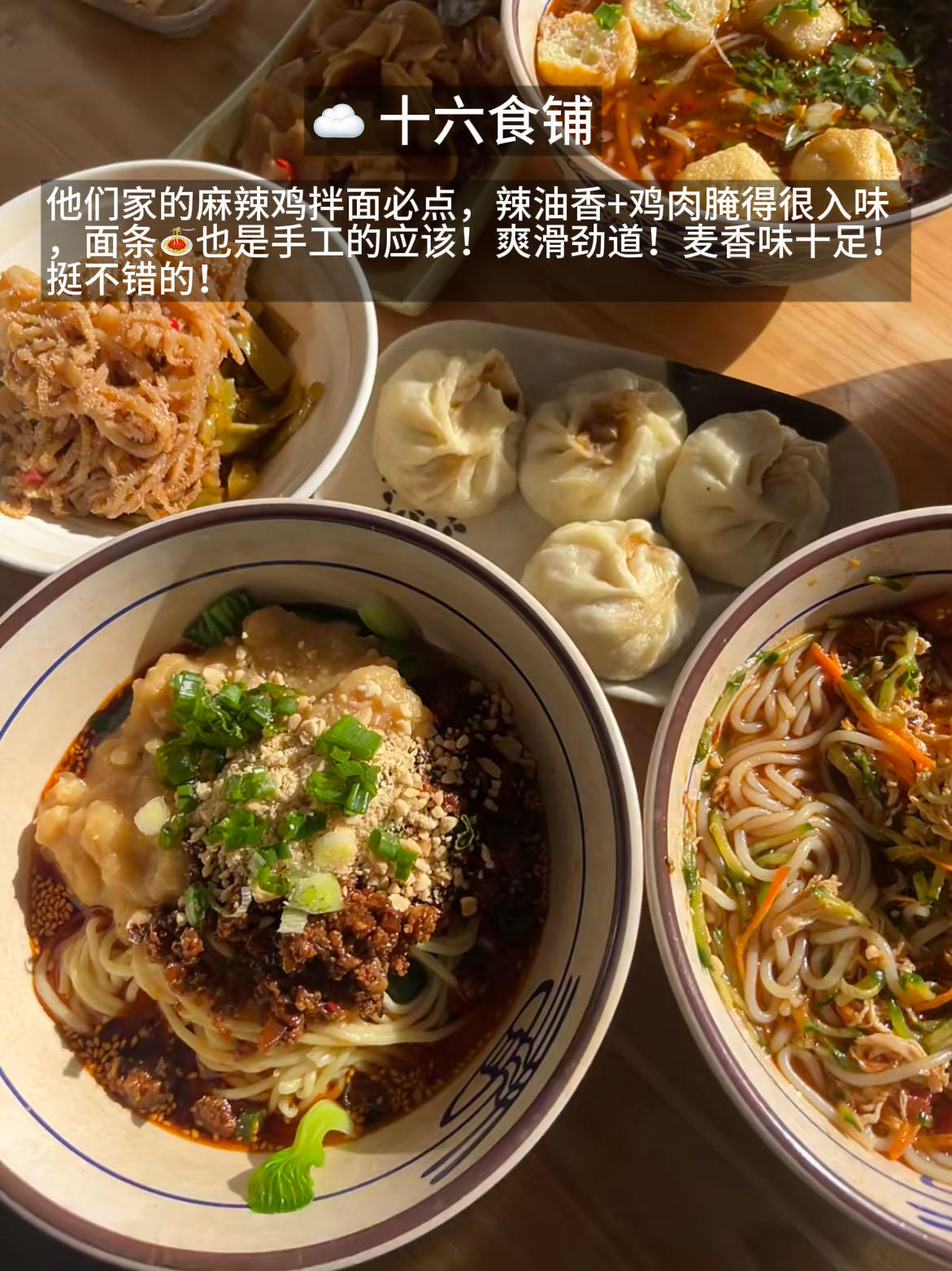 ✔️十六食铺:他们家的麻辣鸡拌面必点,辣油香+鸡肉腌得很入味,面条🍝也是手工的应该!爽滑劲道!麦香味十足!挺不错的!