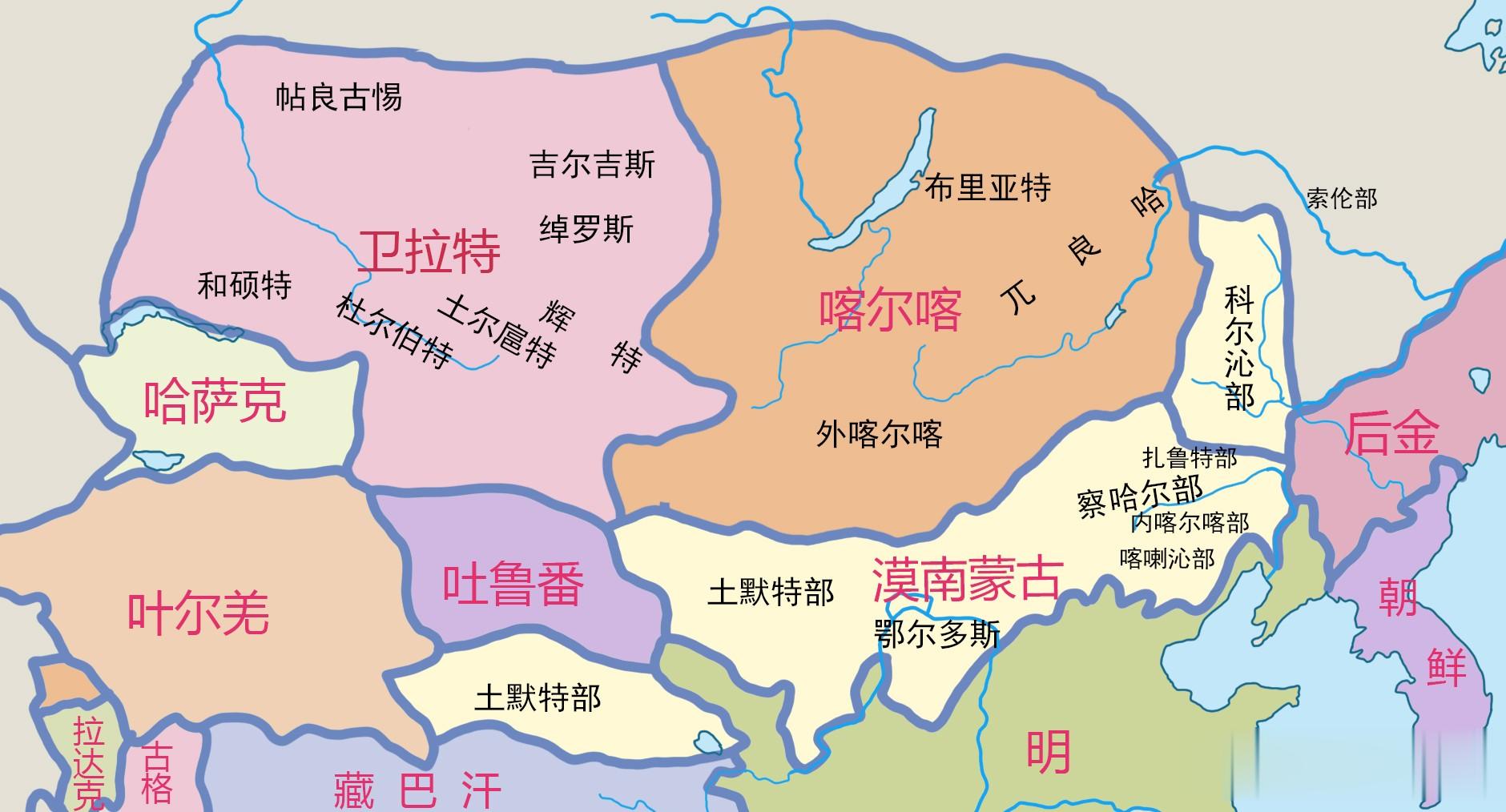 瓦剌主要活动在蒙古高原的西部,其主体是蒙古化的各突厥部落,到明朝后期形成了四大部落,建立了“卫拉特联盟”,此为漠西蒙古。鞑靼,位于蒙古高原东部,也称之为“东蒙古”。明朝中期,达延汗曾一度统一东蒙古各部,将东蒙古划分为了六个万户,其中五个万户位于水草丰美的漠南地区,而喀尔喀万户位于地广人稀的漠北地区。