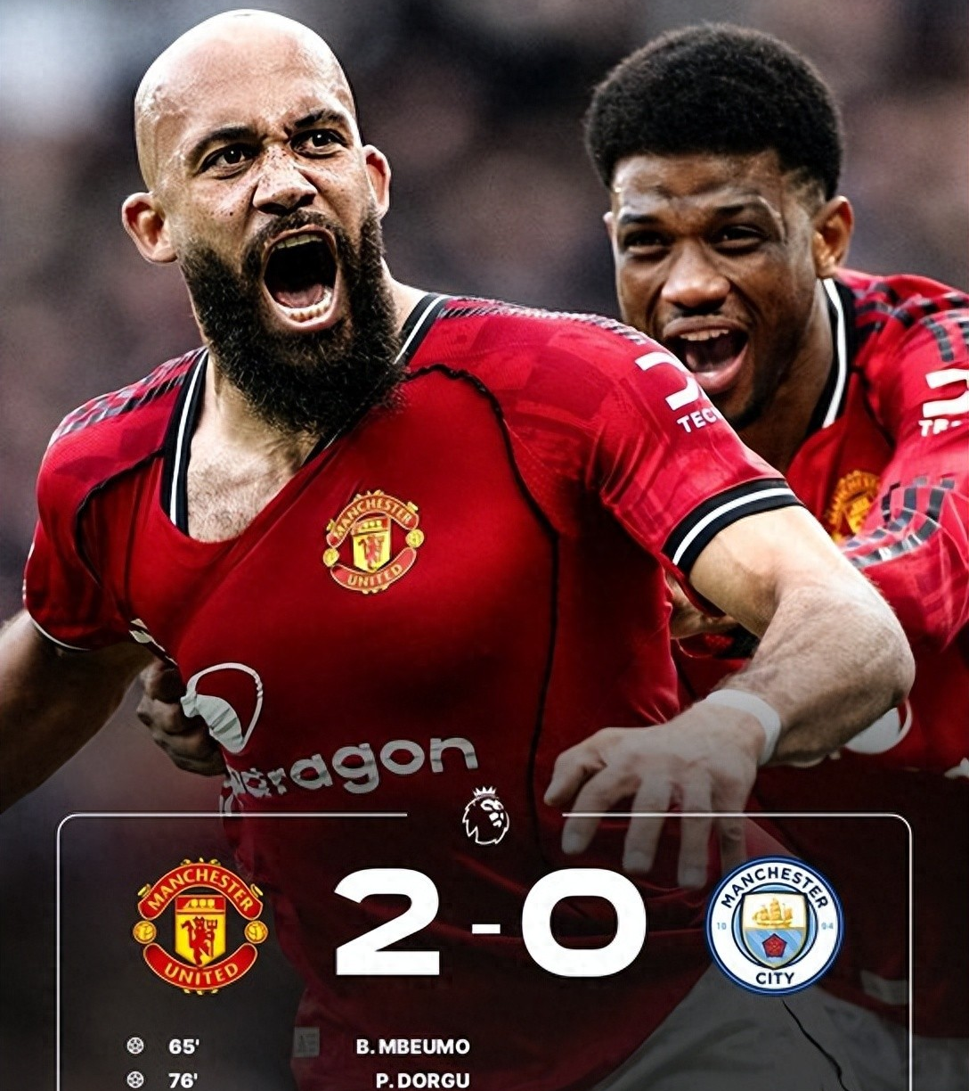 凭借下半场第65分钟姆伯莫和第76分钟多古的进球,曼联最终主场2-0取胜并零封曼城的同时,也终结了球队此前连续4场比赛不胜的尴尬记录。