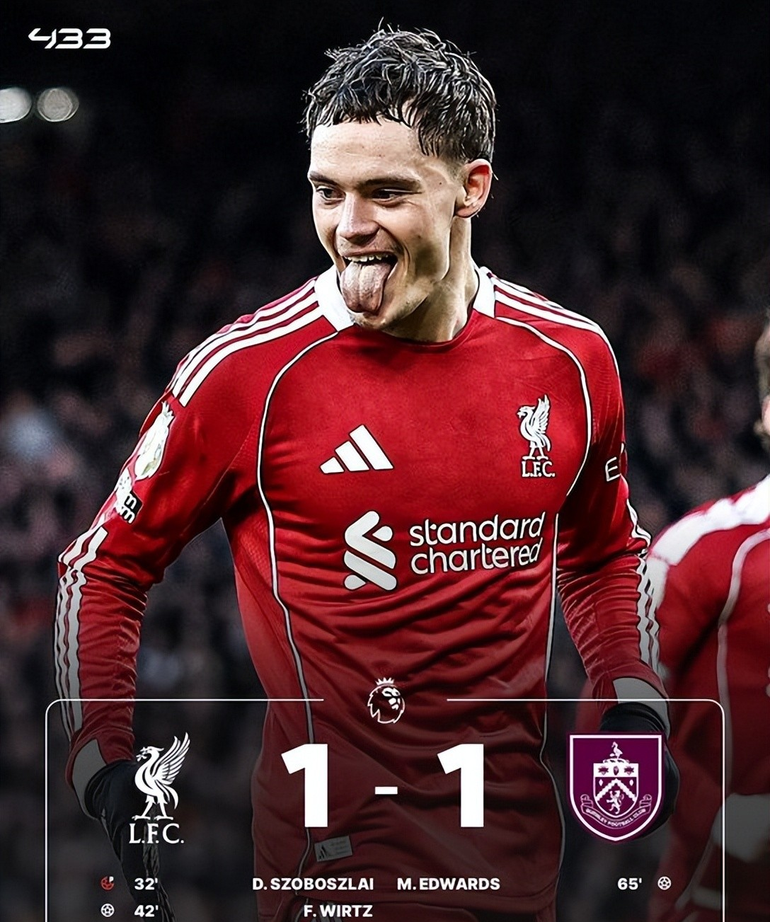 同样只是平局收场的,还有利物浦1-1伯恩利的比赛。