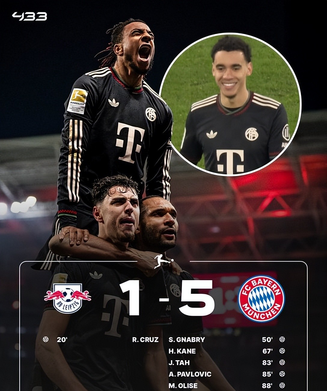 尽管上半场第20分钟罗慕洛就先下一城帮助莱比锡取得了领先并保持到中场休息,但下半场伊始提升了比赛节奏的拜仁,则先后依靠格纳布里,凯恩、塔、帕夫洛维奇和奥丽塞的进球,最终完成了一场客场的逆转并最终大胜对手的精彩比赛。