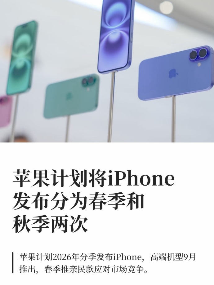 科技大厂苹果计划从2026年起,打破延续近20年的“秋季发布会”传统,首次将iPhone新品发布节奏调整为一年两次,即在秋季(9月)推出高端Pro系列和备受瞩目的首款折叠屏机型iPhone Fold,而在次年春季(3月)再发布标准版和入门机型。对此行业分析普遍认为,这一战略转向是苹果为应对安卓阵营,尤其是中国厂商在创新节奏与细分市场持续冲击的 “防御性调整” 。