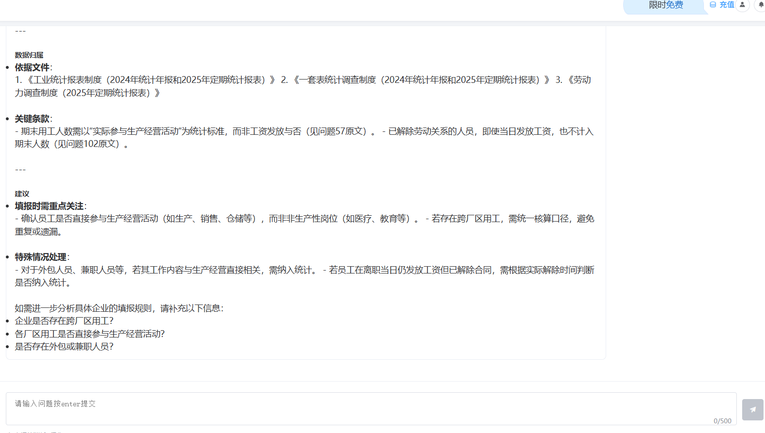 报表智能体是数据国研面向统计人员和财务人员的统计报表填报智能问答助手,依托中国统计培训网权威资源,支持月报、季报、年报等报表口径解释、指标计算示例、制度文本精准检索与自查提示,帮助企业统计人员快速解决填报难题,提升统计数据质量和工作效率。
